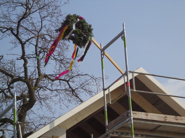 Wir hatten Richtfest bei 26 Grad und die Nachbarn haben den Richtbaum geschmückt und gestellt.