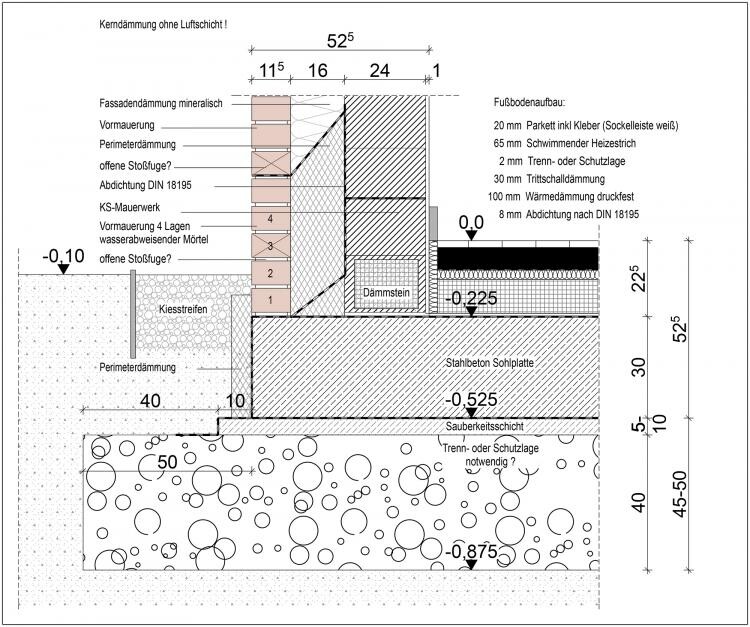 2. vor der Stirnseite der Bodenplatte ist eine Perimeterdämmung angebracht - wie tief ist diese anzubringen? Reicht es bis zur Unterkante Bodenplatte oder wie tief und welche Dicke?