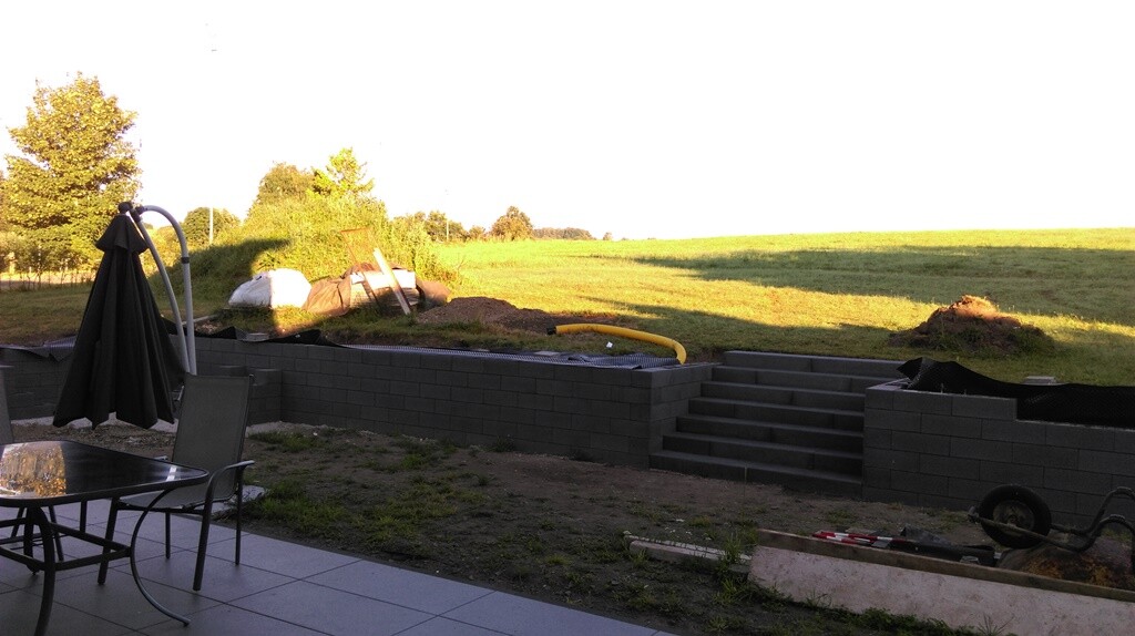 - Setzen einer Treppe von der unterm zur oberen Ebene (7 Stufen je 2m breit - zuerst hatten wir nur 1m Breite vorgesehen, das hätte aber bescheiden ausgesehen)