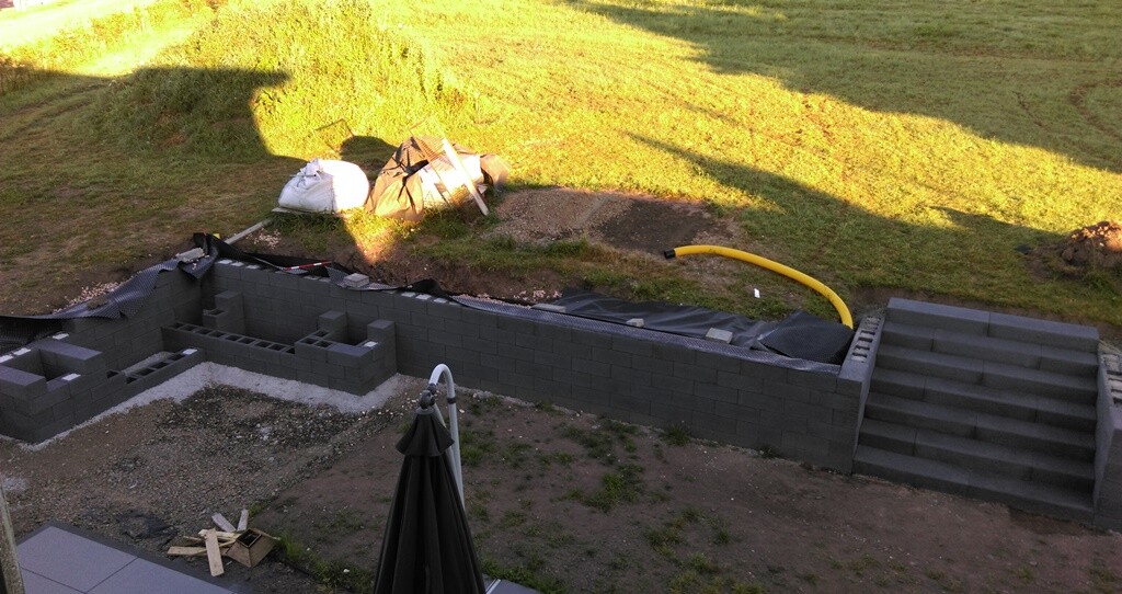 - Erstellen der Mauer inkl. Abdichtung (Dichtschlämme geschützt durch Noppenbahn)