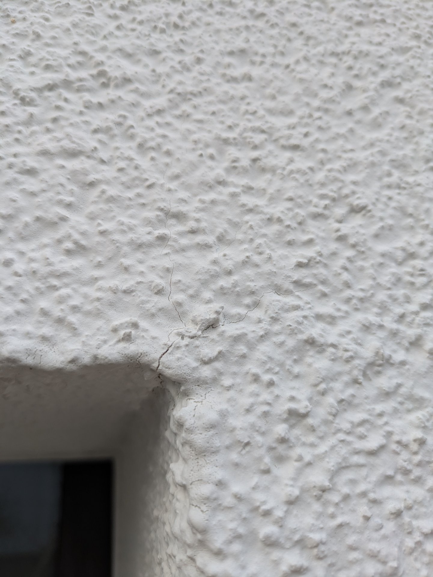 Jetzt, da es wärmer geworden ist, sind mir an einigen Fenster und der Haustür diese leichten Risse in den Ecken aufgefallen. An den Alufensterbänken ist aber nichts eingerissen. Der Chef der ausführenden Firma hat mitsamt eines Außendienstlers von Caparol (System Hersteller) diese Risse begutachtet.