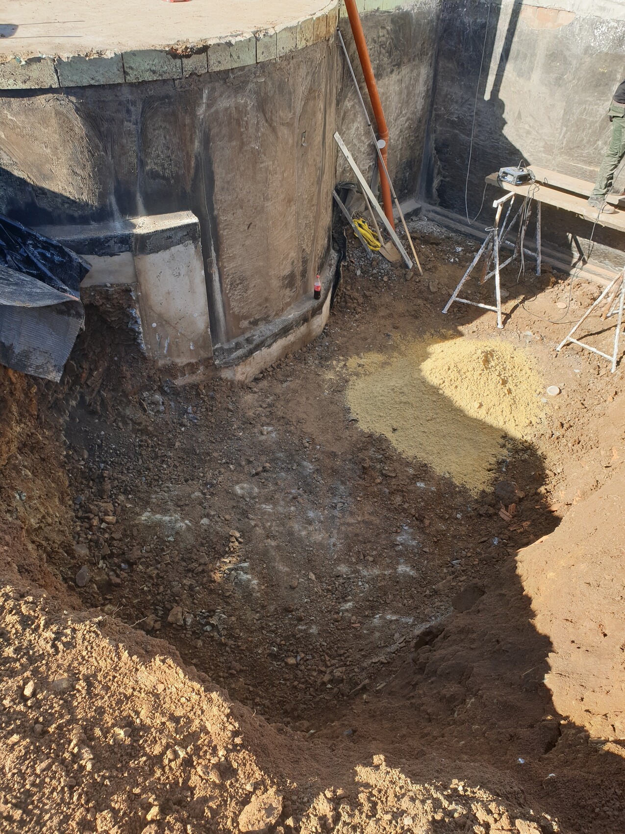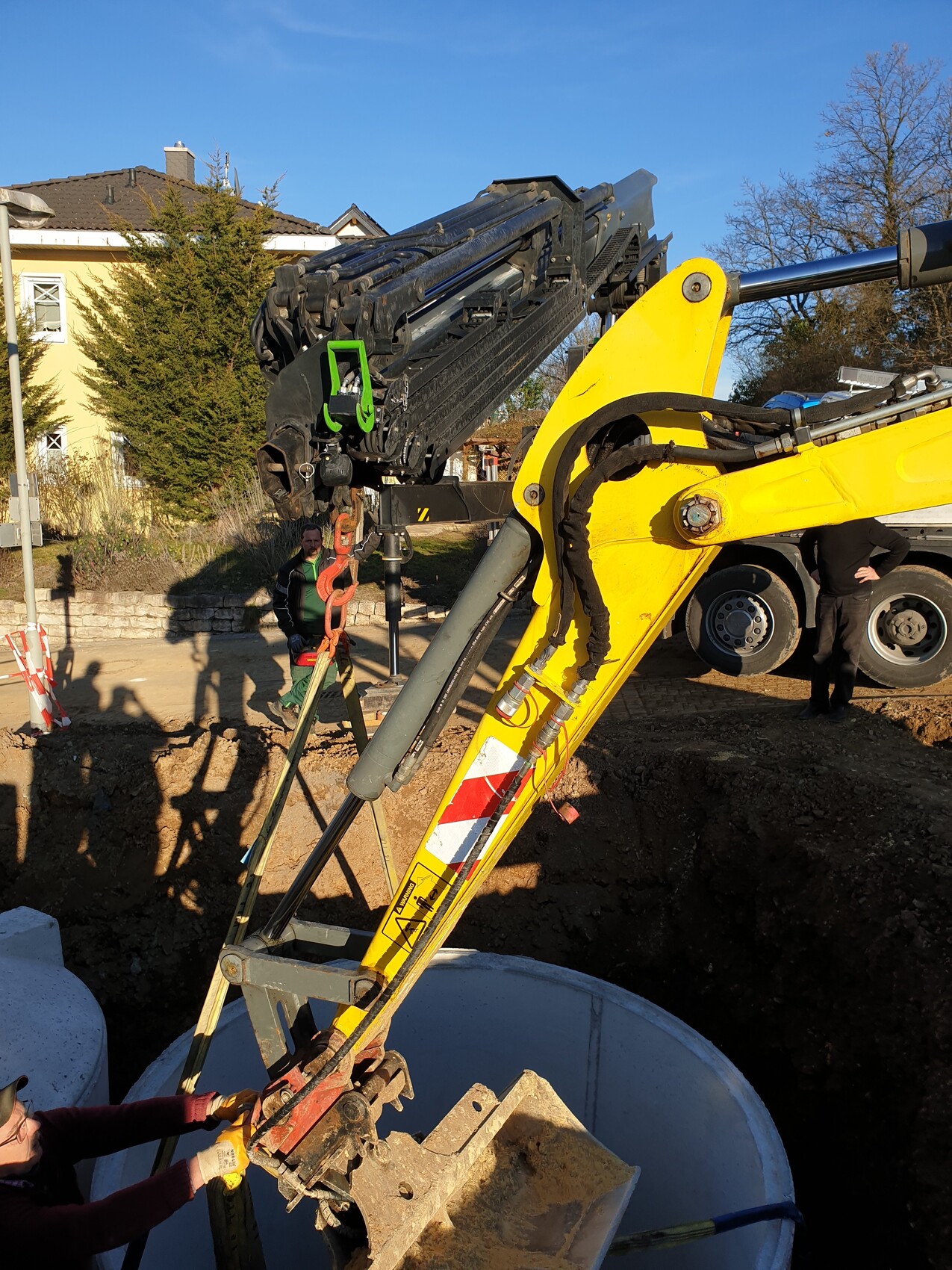 Der Kranwagen der die Zisternern liefern und einbauen sollte kam nicht genau da hin wo sie hin sollten haben wir kurzerhand den Bagger beim Ausrichten mit einbezogen. Jede 10.000 Liter und 6.5T schwer Das richtige Werkzeug ist da A und O 🙂