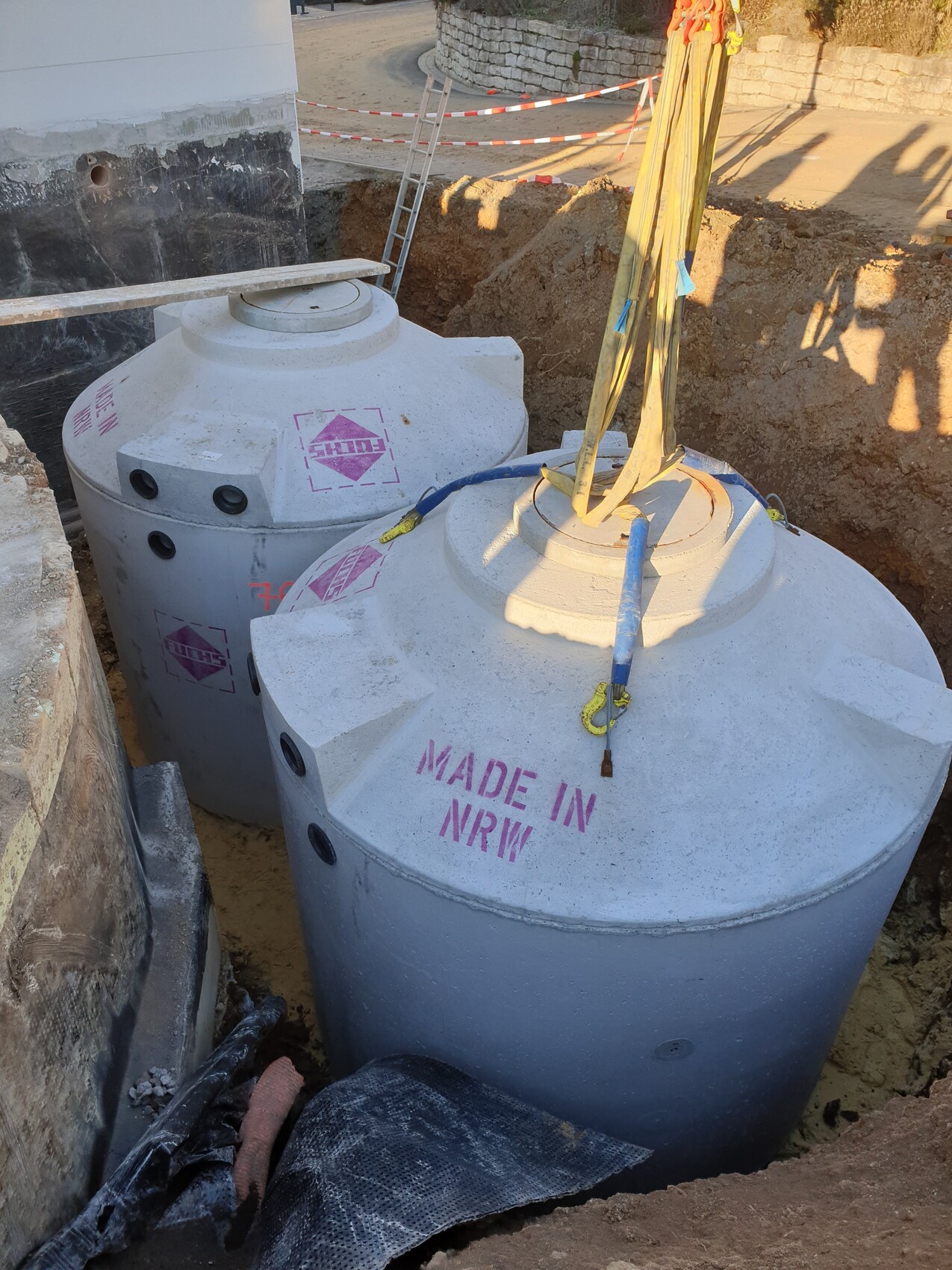 Zwei große graue Tanks auf einer Baugrube mit Hebezeug und Absperrband im Hintergrund.