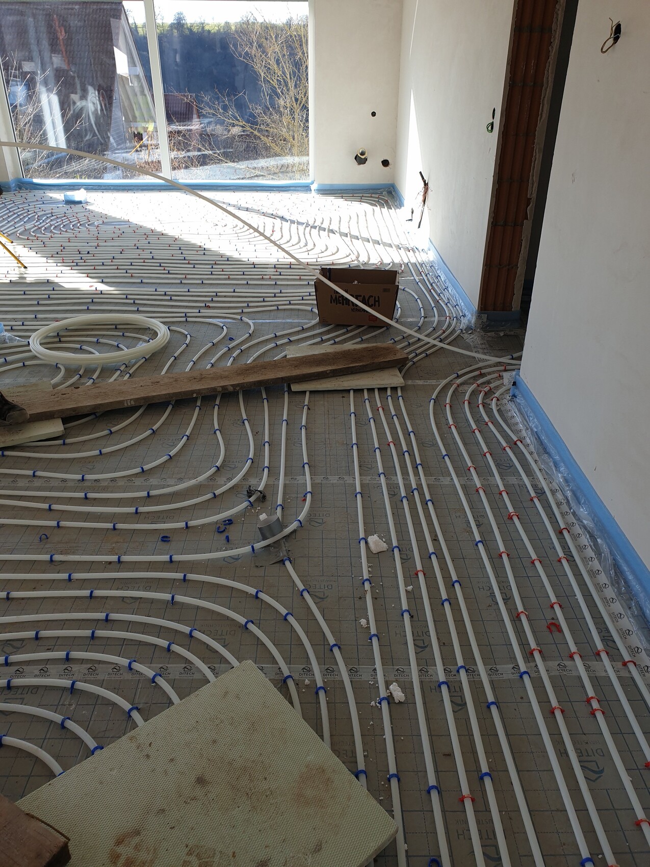 Raum mit verlegter Fußbodenheizung: weiße Rohre in Muster auf Unterlage, Fensterfront.