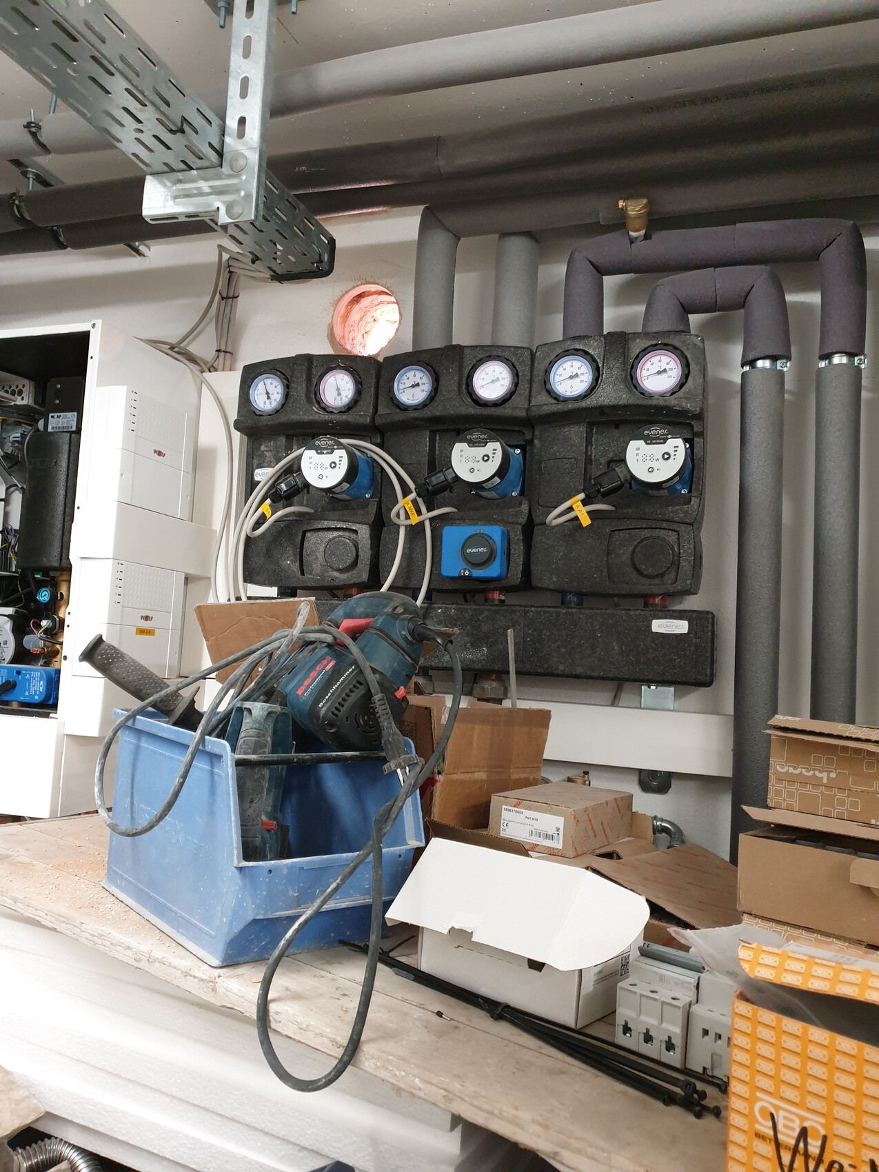 Technikraum mit Rohrleitungen und Druckanzeigen; Bohrmaschine in blauer Kiste, Kartons.