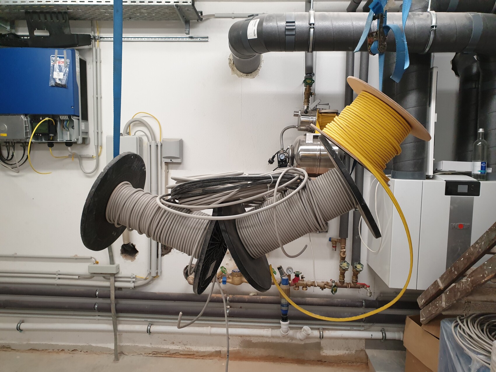 Industrie-Raum mit großen Spulen: graue Schlauchrollen, gelbe Kabelrolle, Rohrleitungen und Ventile.