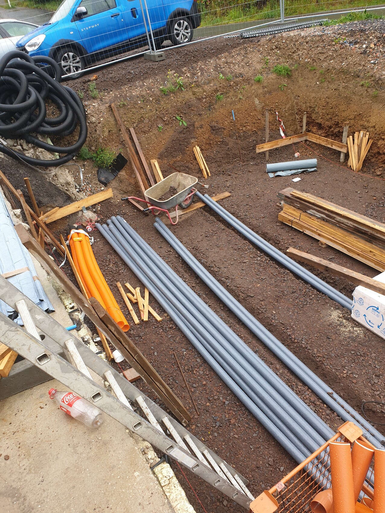 Die Koffer sind aktuell für die Zuläufe und Abläufe im Boden. Da die Einbauteile erst ende des Jahres kommen haben wir die Aussparungen freigelassen und bauen die dann nächstes Jahr ein.