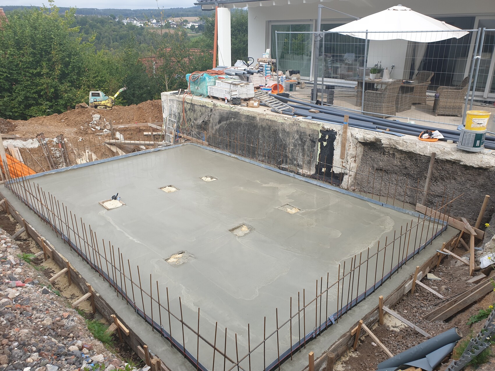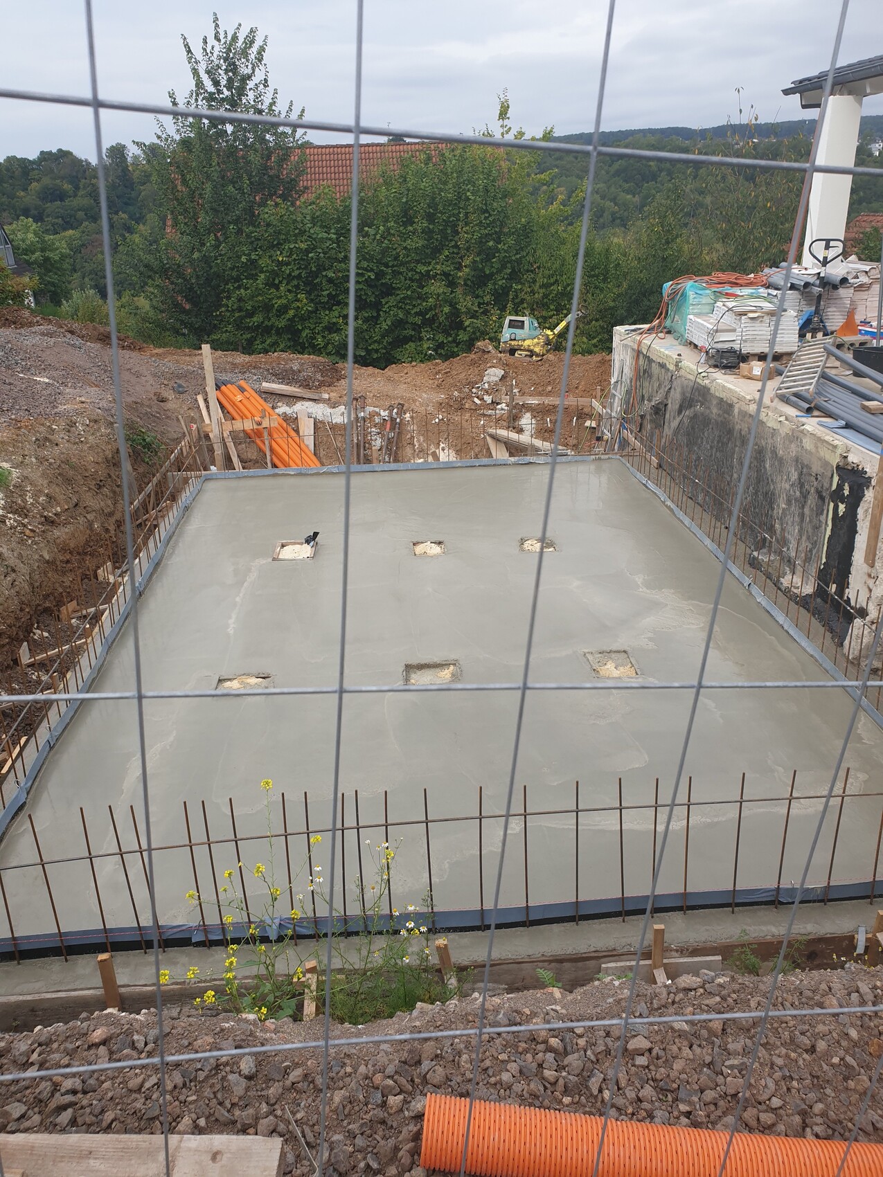 Der jetzige ZUstand ist die heute frisch gegossene Bodenplatte. In circa 2 Wochen kommen die Sandwichwände die dann gestellt werden und die filigrandecke für die Flachzone. Der Raum wird gemauert.