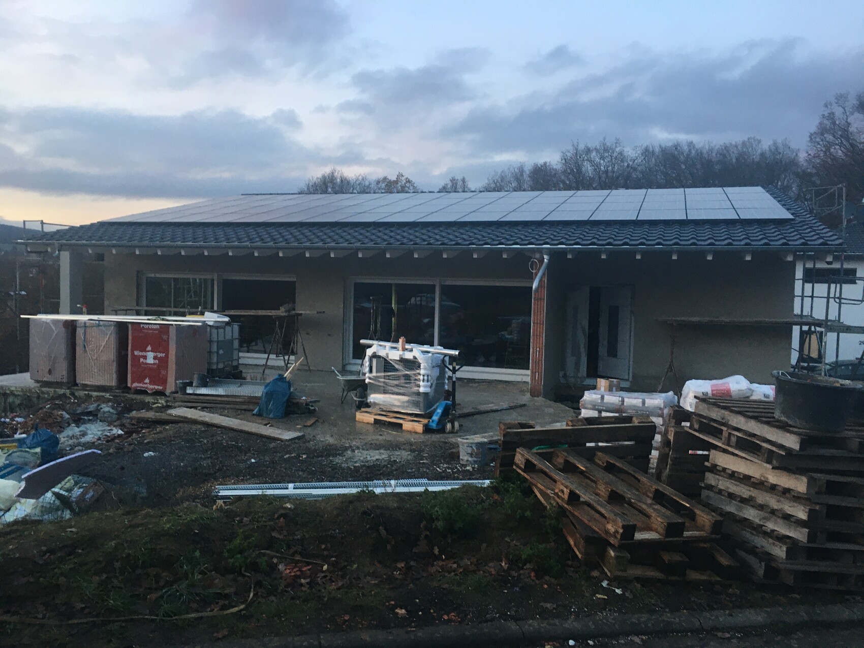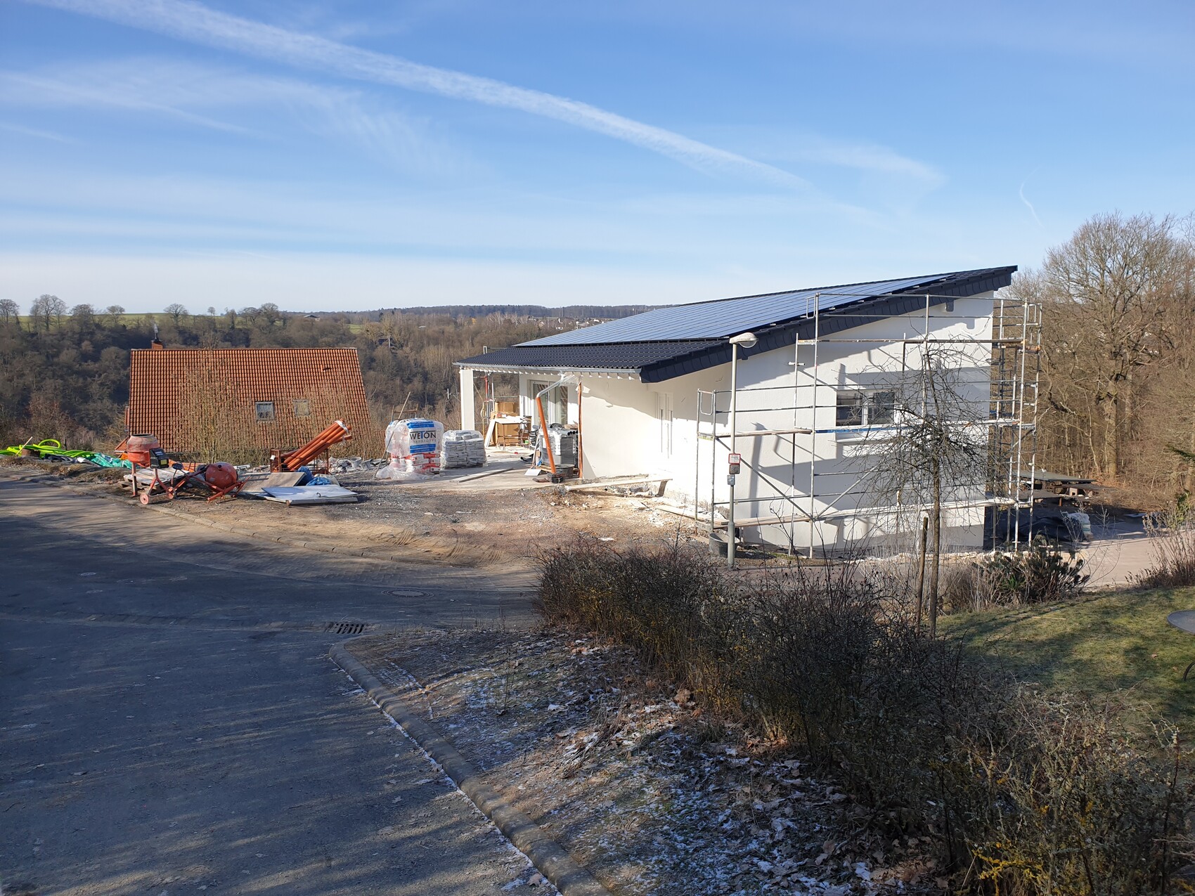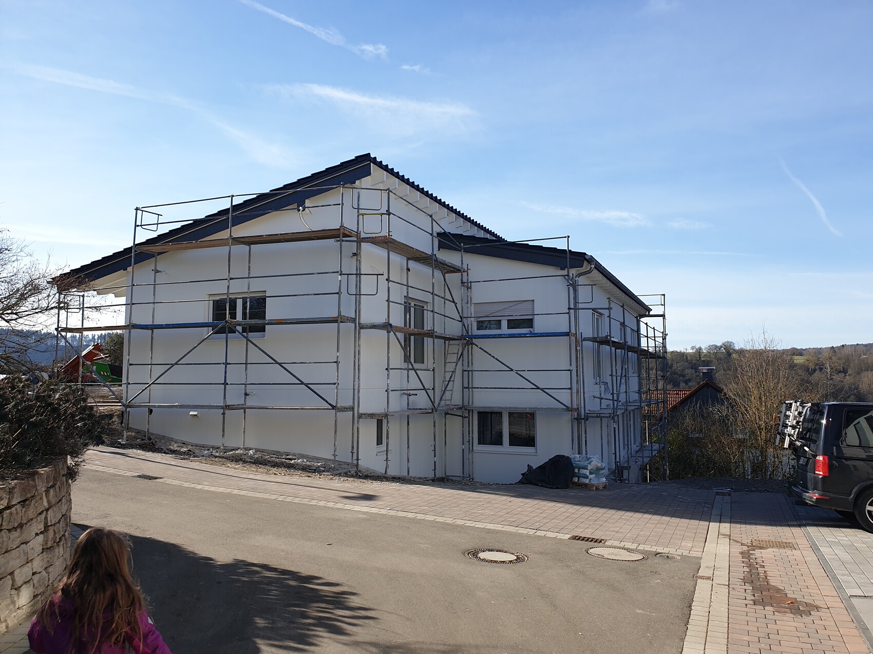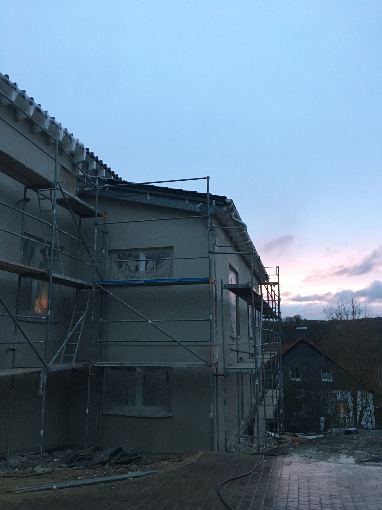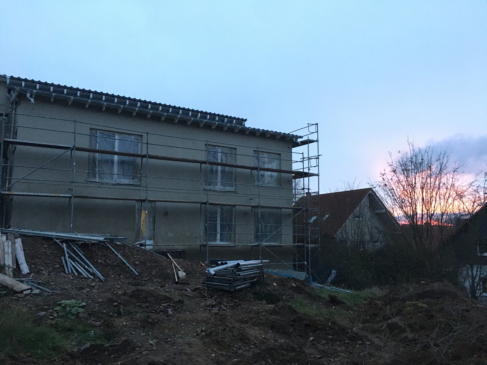 Außenansicht ist soweit fertig. Wir wollten noch einen Edelstahlaußenkamin anbringen, da fehlte leider ein Stück. Das müssen wir nun am kommenden Wochenende nachholen. Dann das Gerüst flink runterbauen. Es ist verkauft und wird abgeholt 🙂 Schafft wieder Platz und bringt mir etwas Geld um noch ne gescheite Rüttelplatte zu kaufen. Der Bagger schnurrt wie ein Kätzchen und wartet nun auch loszulegen.