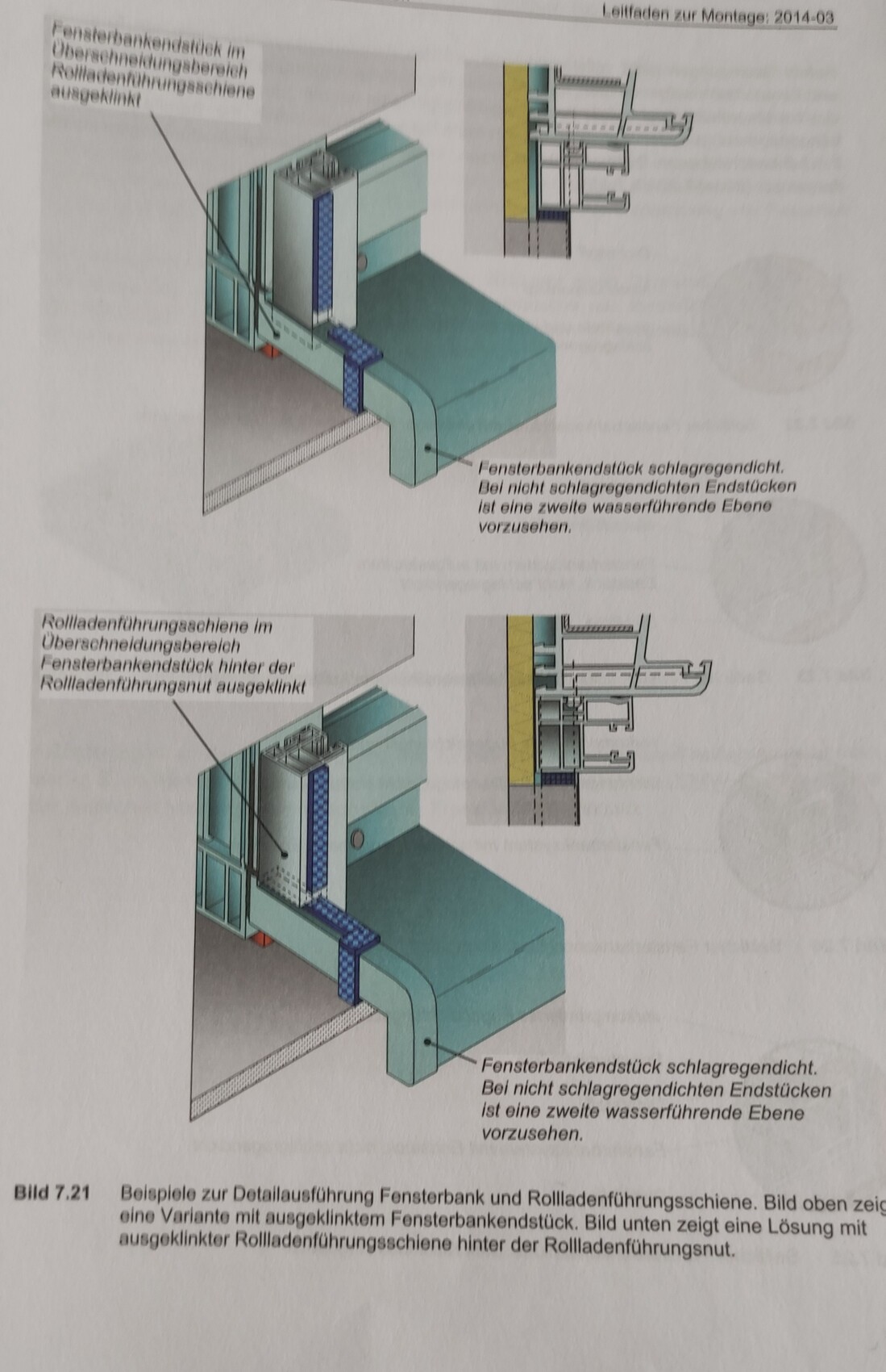 Unabhängig von der Lichtdichtheit, ist darauf zu achten, ob die Endstücke schlagregendicht sind. Wenn nicht, ist unter der Fensterbank eine zweite wasserführende Ebene auszubilden.