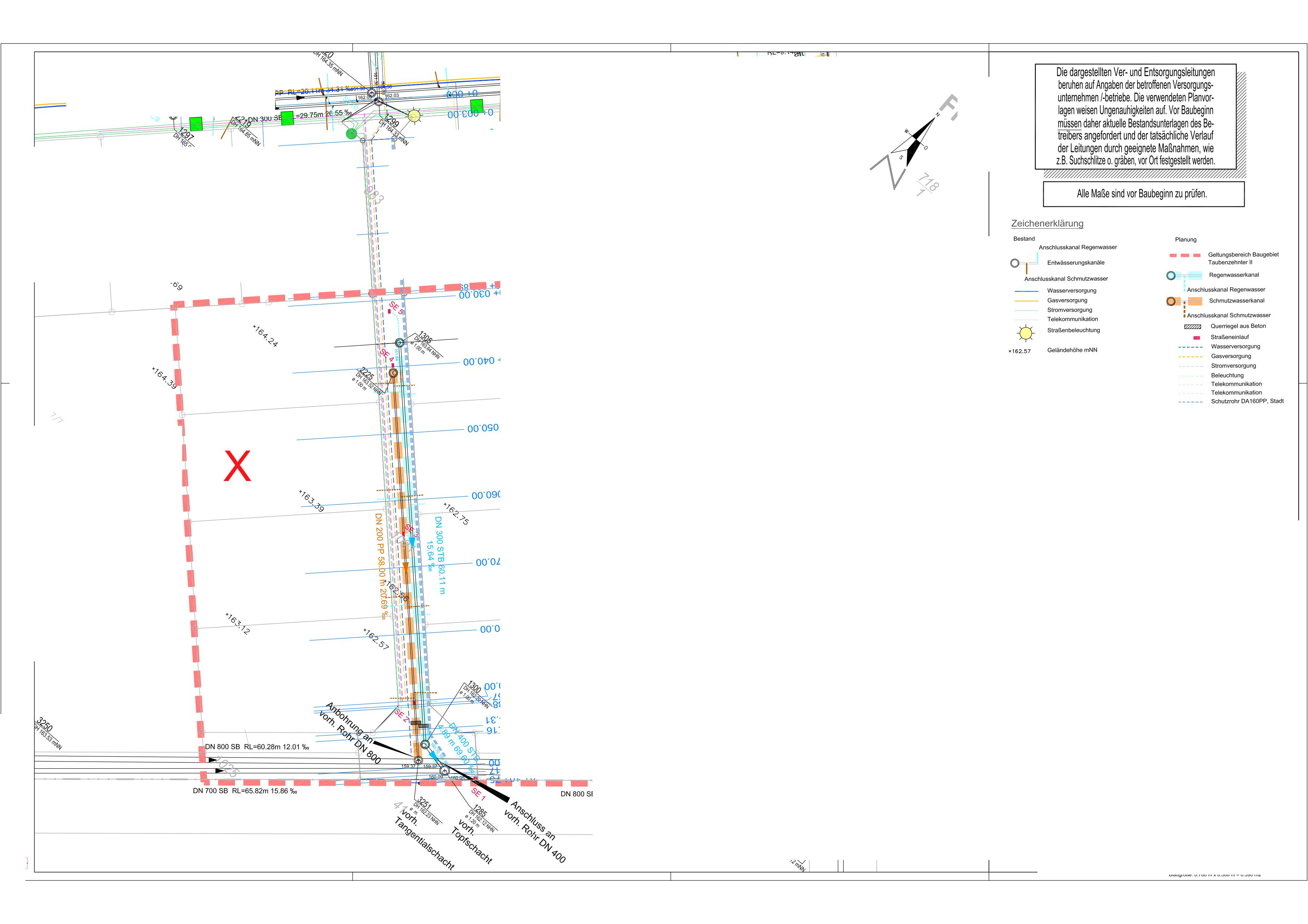 Das Grundstück liegt an einer leicht abschüssigen Straße (auf dem Plan abschüssig von oben nach unten). Anbei der Entwässerungsplan der Stadt sowie ein Schnitt des geplanten Hauses, beides mit Höhenangaben.