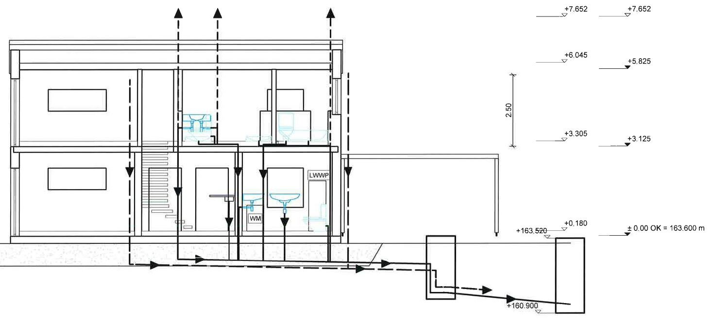 - OK Bodenplatte ist auf 163,30m NHN, plus 0,18m Fußbodenaufbau, plus ca. 0,20m bis zu Abfluss der Toilette = 163,68m NHN