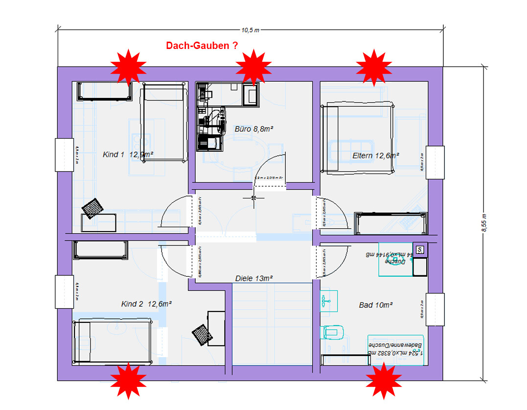 Wenn tatsächlich ein Mansardendach käme, wären oben Gauben eigentlich Pflicht. Naja, da müssen wir erst noch im Lotto gewinnen. Mein Programm tut sich schwer mit Gaube einzeichnen. Deswegen erst mal nur Sterne. Also kleiner geht glaub ich wirklich nicht, wenn man großen Hauswirtschaftsraum, 2 Kinder, Büro und Garderobe braucht auf Bodenplatte.