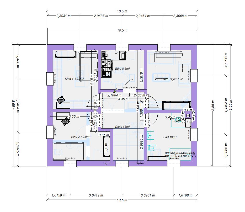 1.) Warum engst du die Kinderzimmer künstlich ein und vergrößerst den Flur? Nur damit die Kinderzimmern gleich groß sind?Nö, wie meisten das genau? Soll ich die Wand noch weiter nach rechts schieben? Dann bleibt vom Büro nichts mehr übrig. Und Büro muss sein, der Mann arbeitet von zu Hause derzeit.Musketier schrieb: