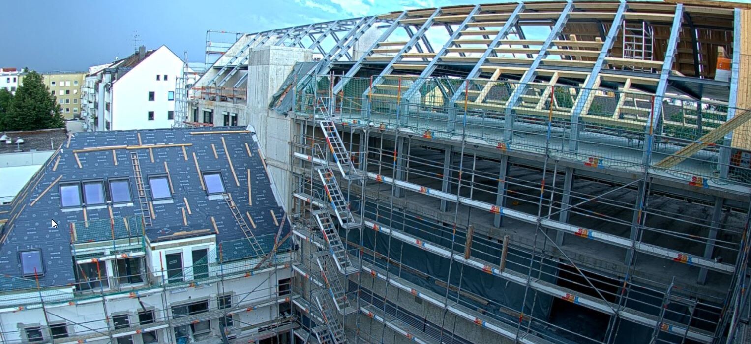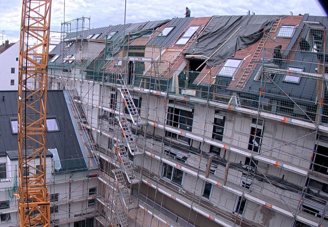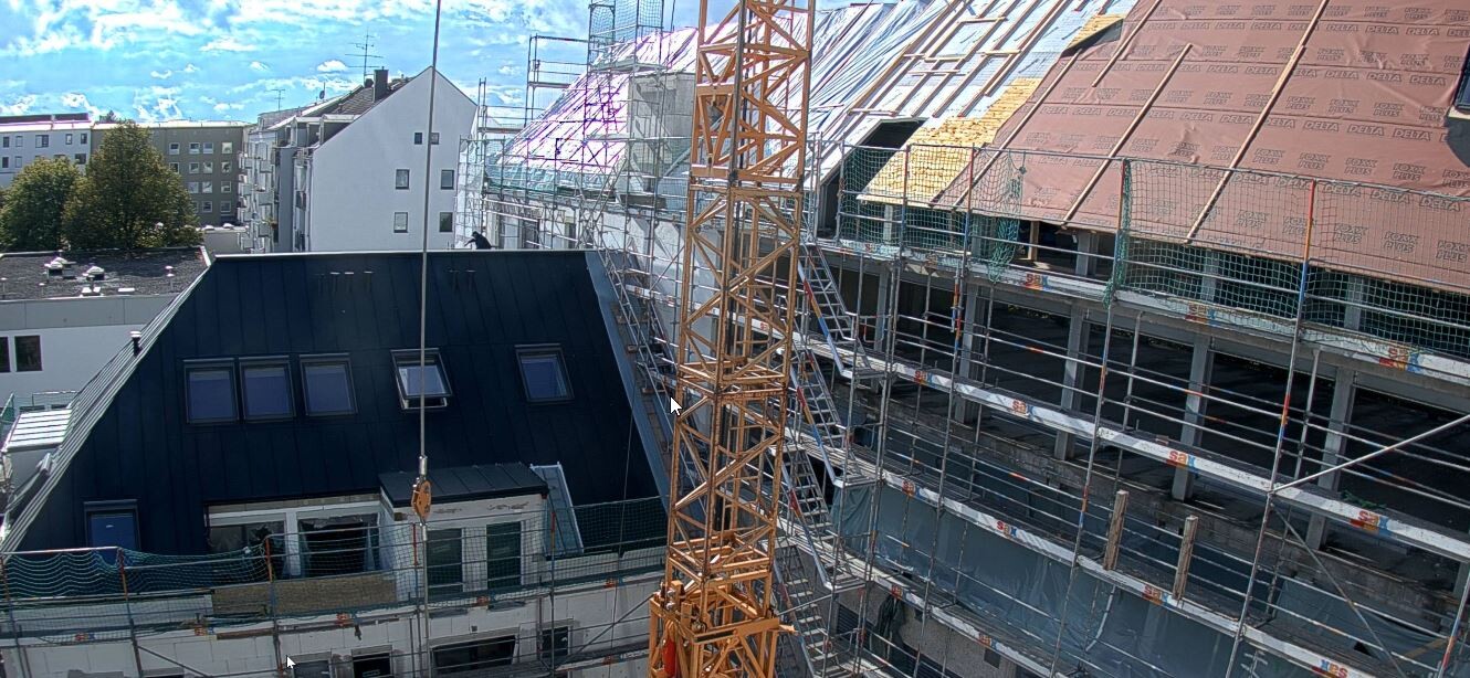 Was mich zu meiner eigentlichen Frage bringt: Was ist das für eine seltsame Dachkonstruktion? Wo ist die Isolierung? Die Dachpfetten sind als Stahlträger ausgeführt und anscheinend nach außen nicht weiter isoliert. Gibt das nicht eine 1A Kältebrücke? Die Träger gehen runter bis auf oder sogar in die Deckenkonstruktion.