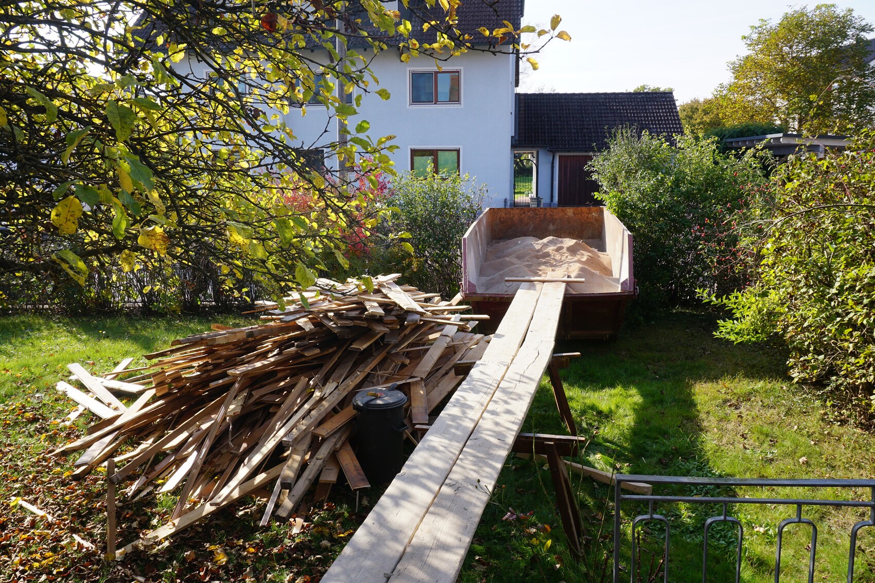 Wir waren am Wochenende fleißig und haben knapp acht Tonnen Sand aus dem EG rausgeschaufelt. Davor natürlich die Bodenbretter rausgerissen und mangels zweitem Container (ich Idiot) erstmal in den Garten geschmissen. Durfte also gestern nochmal ran und den ganzen Kram noch in den dann bestellten Container befördern. Wers nicht im Kopf hat, hats in den Armen 😀