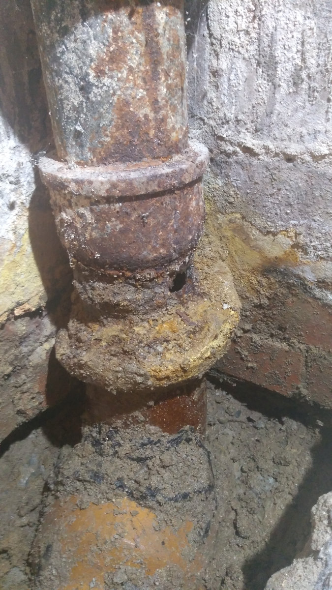 Als erstes gibt es dem Abwasserrohr im "Heizungsraum" an den Kragen. Wie zu sehen ist die Ecke schon sehr feucht und das Gussrohr schon stark angegriffen. Nach dem Freilegen zeigte sich folgender Zustand: