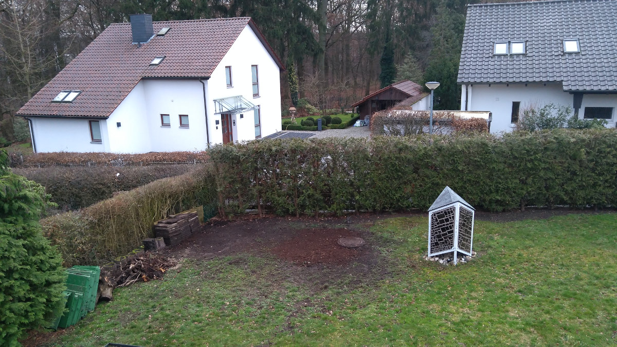 Der Garten war zum Jahresende ein Schlachtfeld. Nachdem der große Rest der Haselnuss befreit war konnte der Boden etwas aufgefüllt und der Kompost entfernt werden.