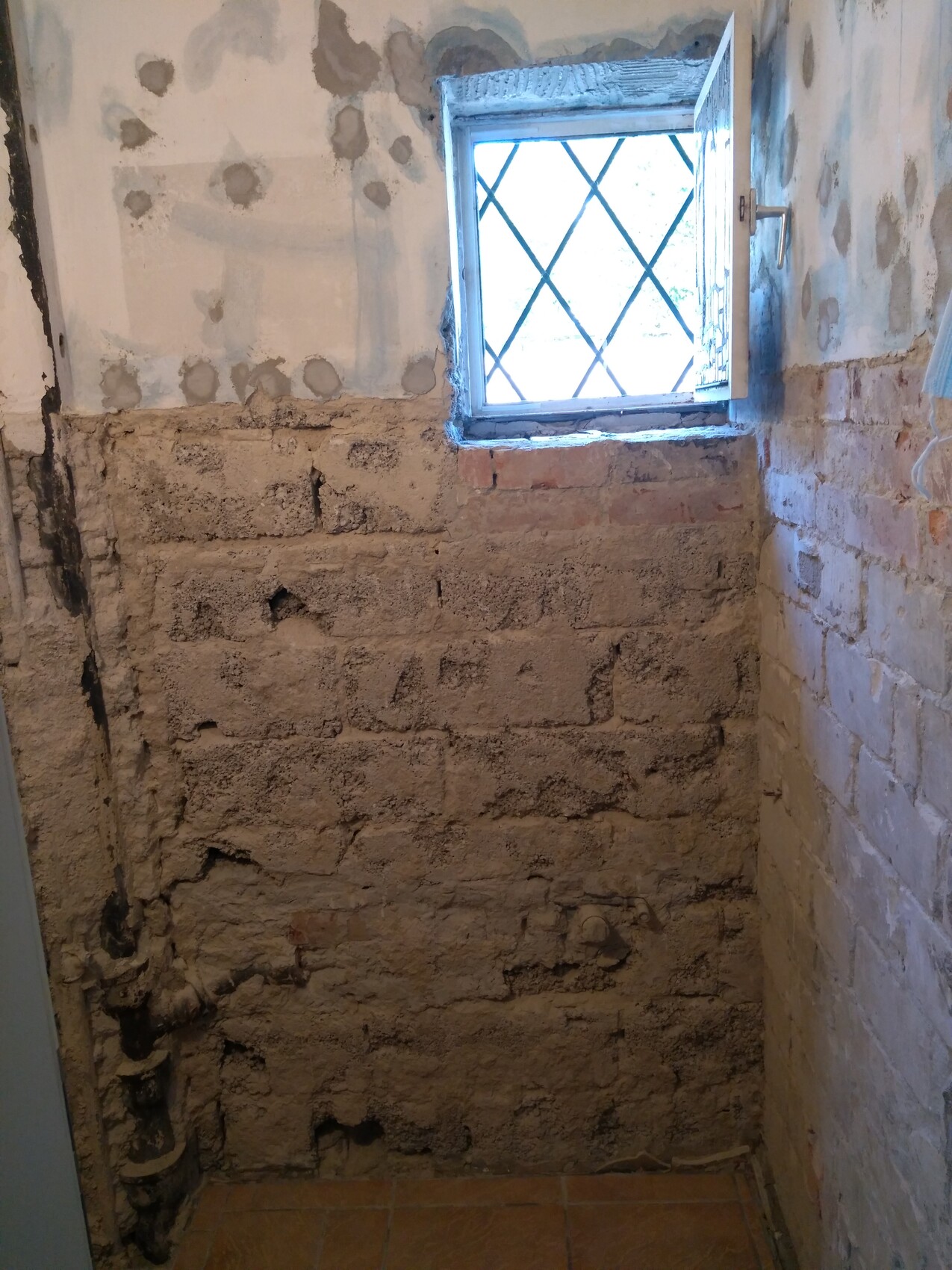 Der Fliesenbereich ist schon neu verputzt. Nach dem Schlitzen und Verlegen der neuen Leitungen kann dann wandhoch verputzt werden.