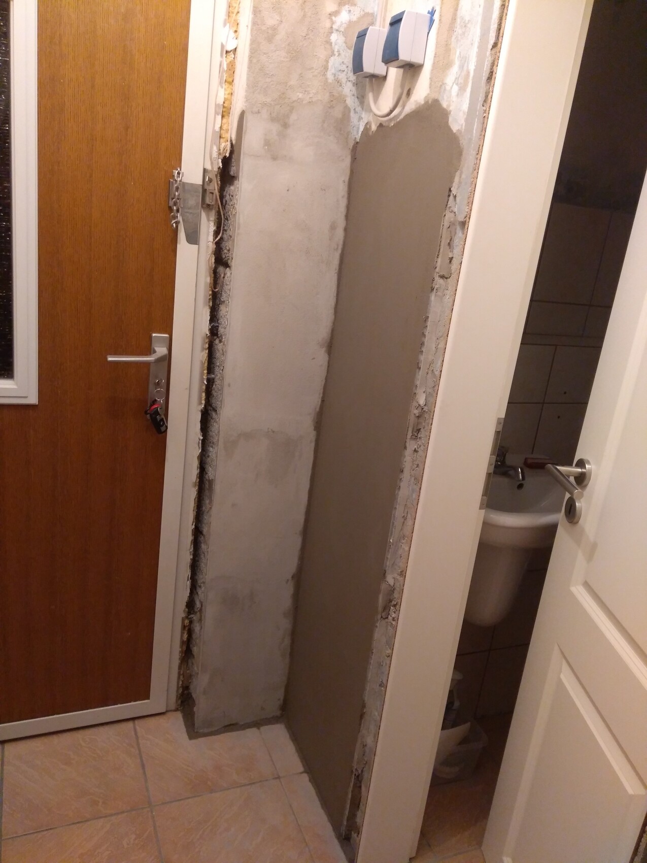 Zuvor haben wir schon im Windfang die Fliesen von der Wand entfernt und in beiden Räumen die alte Elektrik aus dem Putz gerissen.