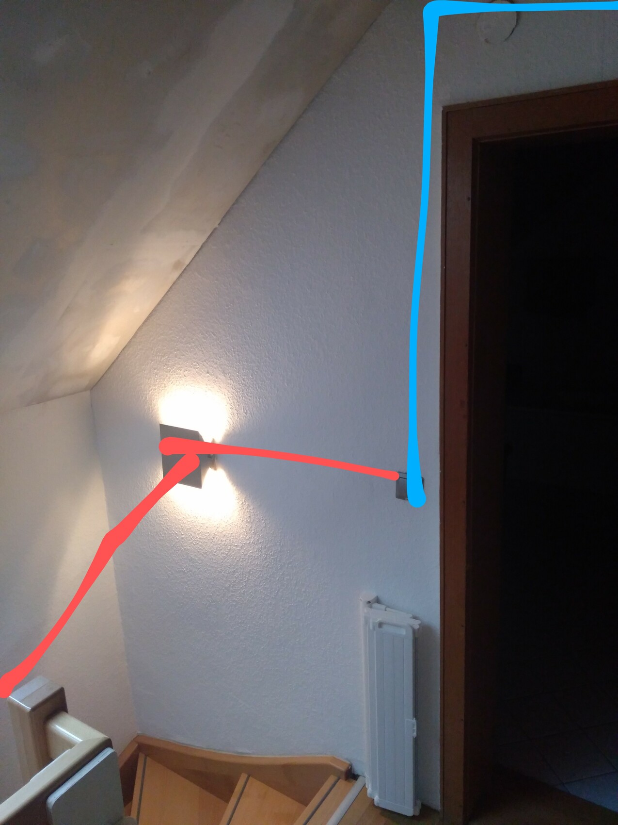 Die Originalleitungen (blau) sind so verlegt. Der Vorvorbesitzer hat aber Lampen im Treppenhaus nachgerüstet. Auf mittiger Höhe vom Lichtschalter grade rüber zur Lampe 1 und dann schräg die Wand lang der Treppe folgend zur Nr. 2 runter (rot) und zum zweiten Schalter endend.