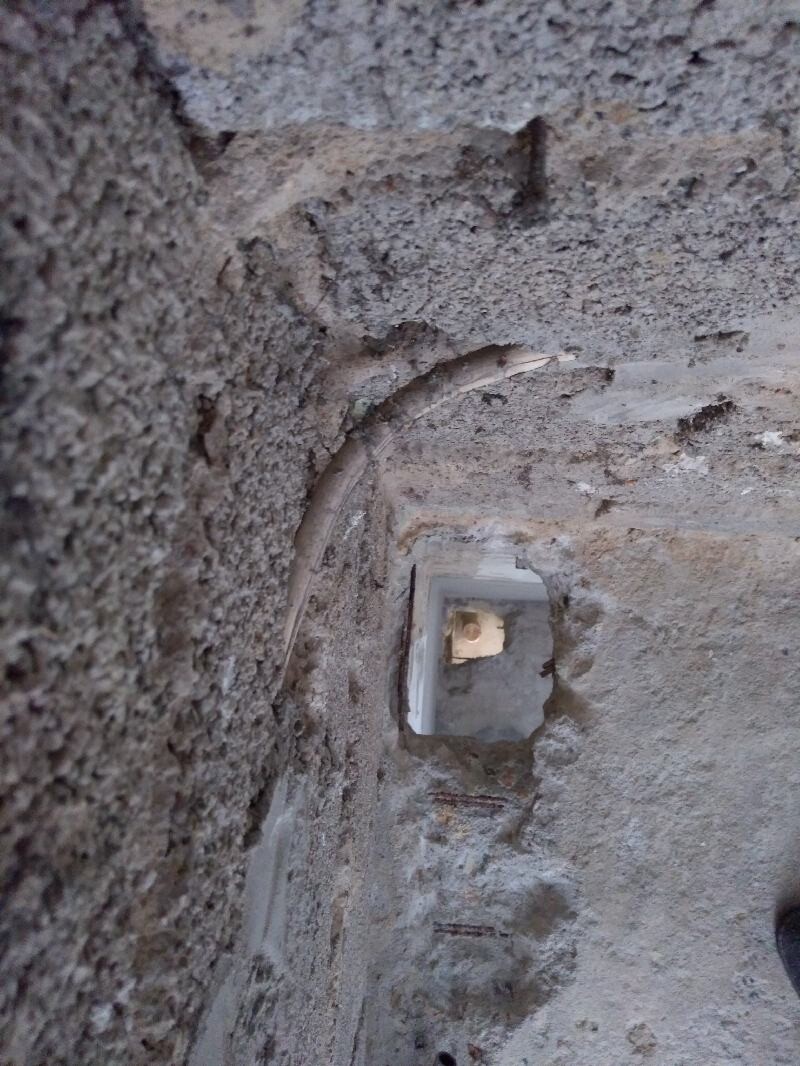 Wenn man alles schön verputz hat, kann man wieder Löcher in die Wand hauen. In diesem Fall für die Heizung und Steckdose.