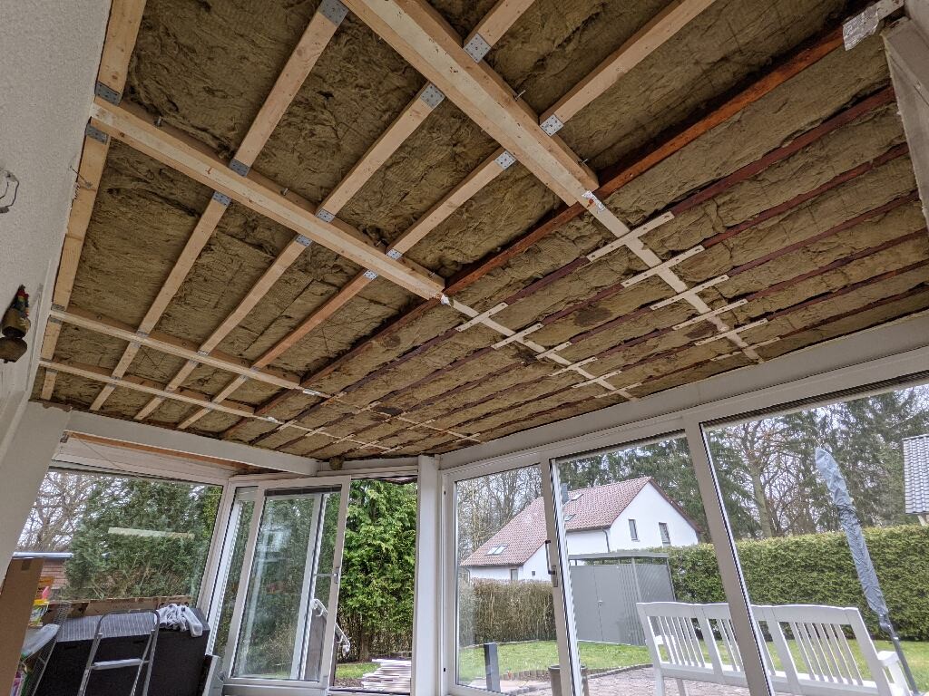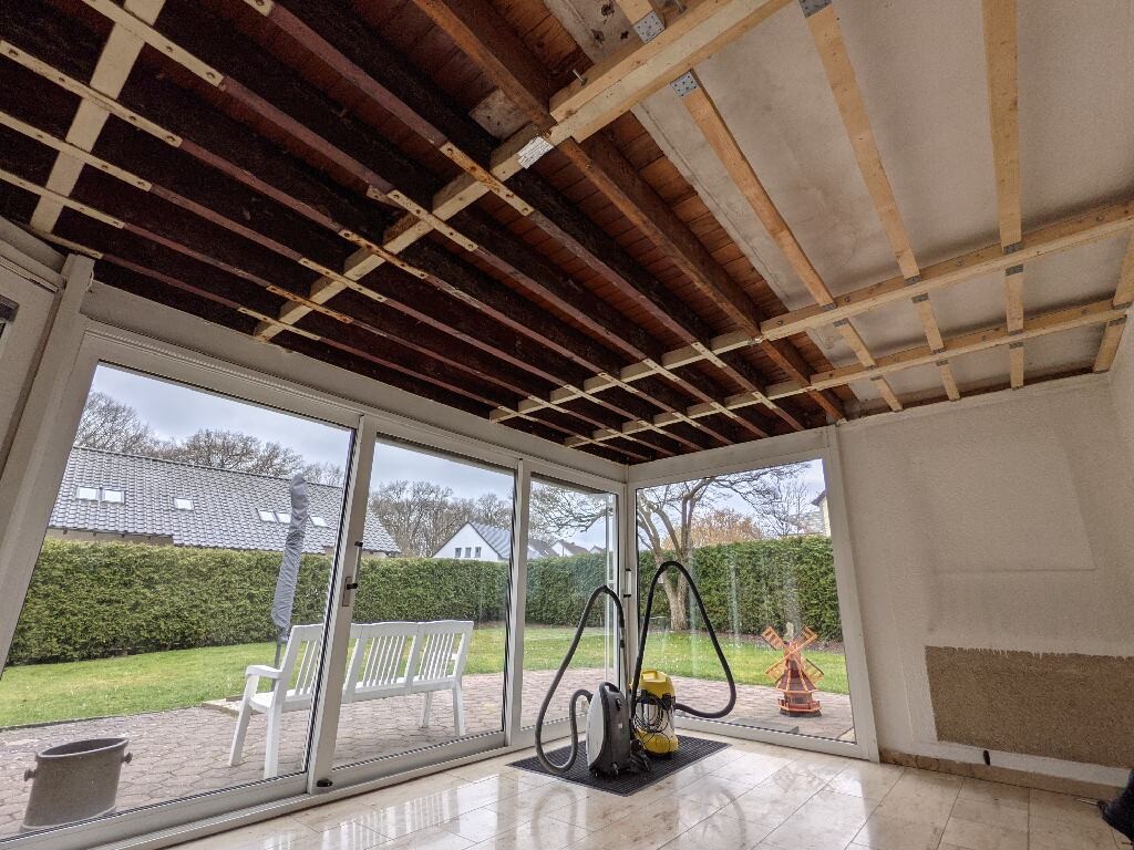 Im baufälligem Wintergarten gab es an den Deckenpaneelen einige Wasserflecken. Nach Entfernung zeigten sich größere Wasseransammlungen hinter der Folie. Also alles inkl. durchnässtem Dämmstoff entfernt.