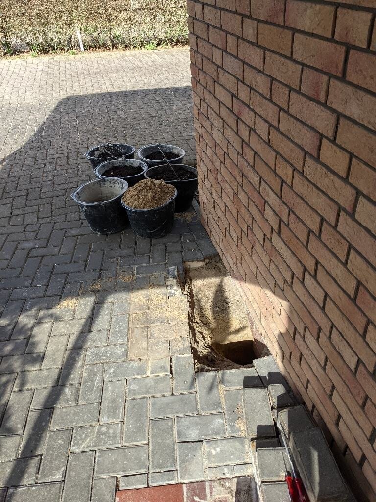 Mehrere Eimer Sand neben einer Baugrube an einer Backsteinwand auf gepflastertem Boden.