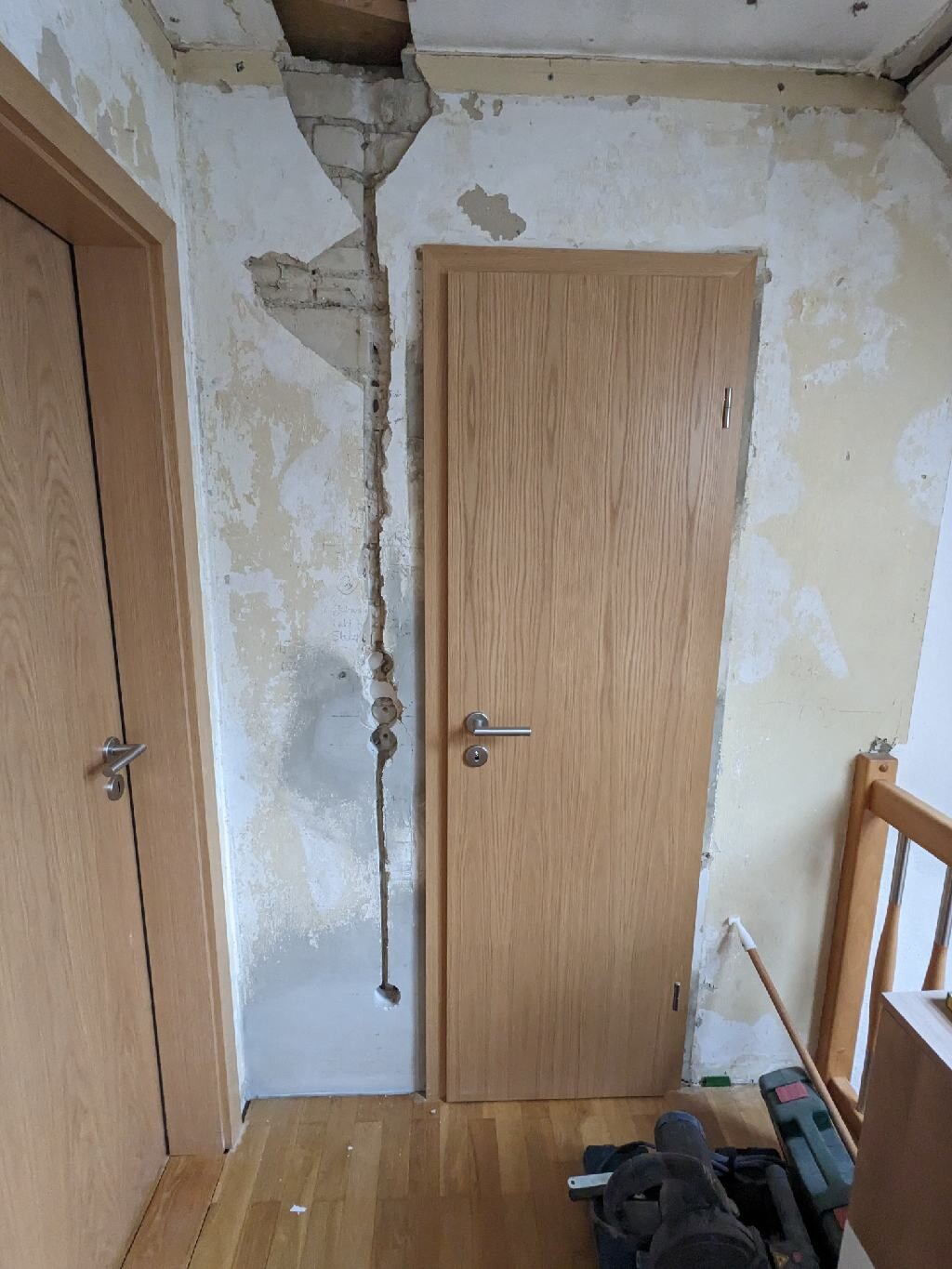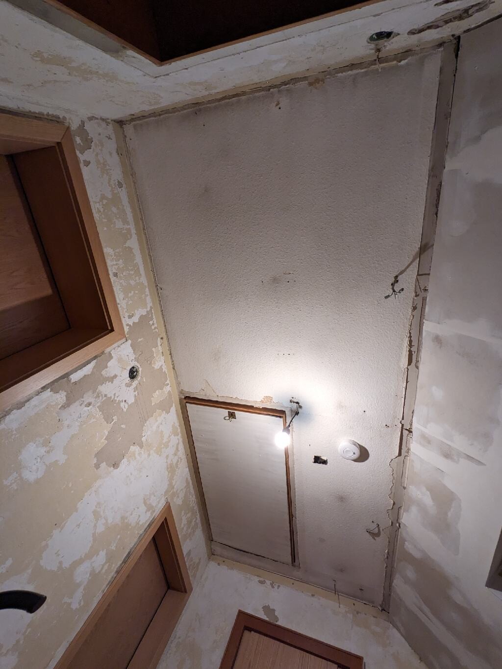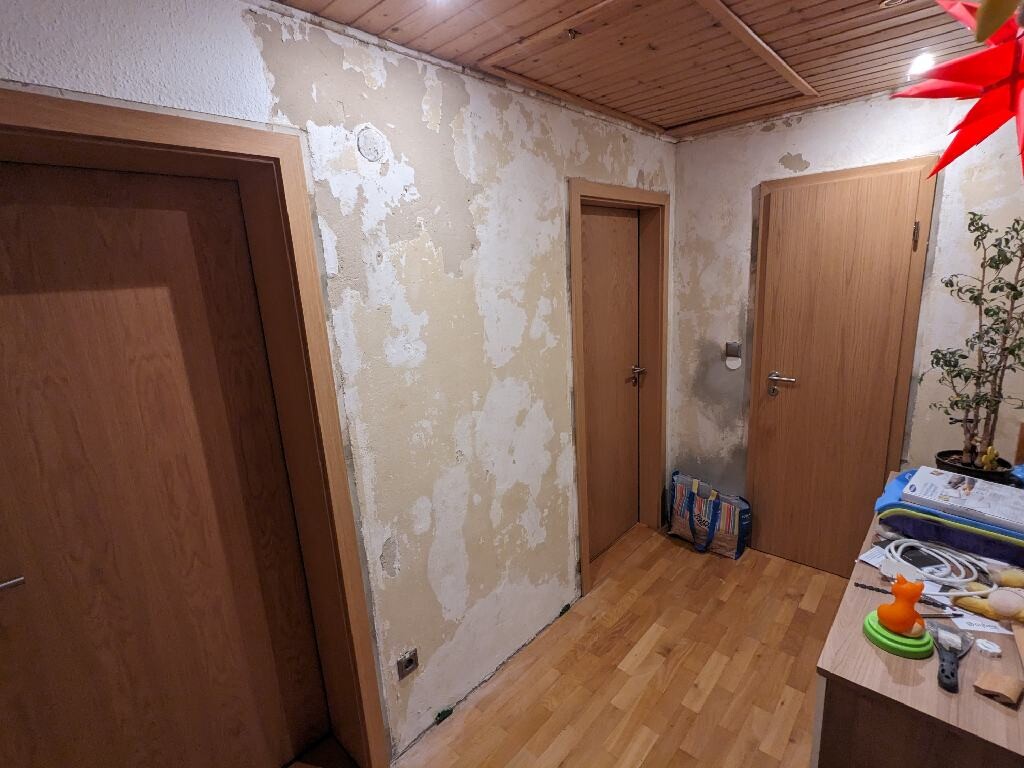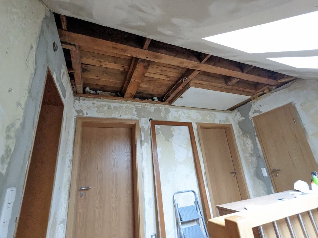 Im OG-Flur Tapete und Deckenverkleidung entfernt. Damit alles neu kann.