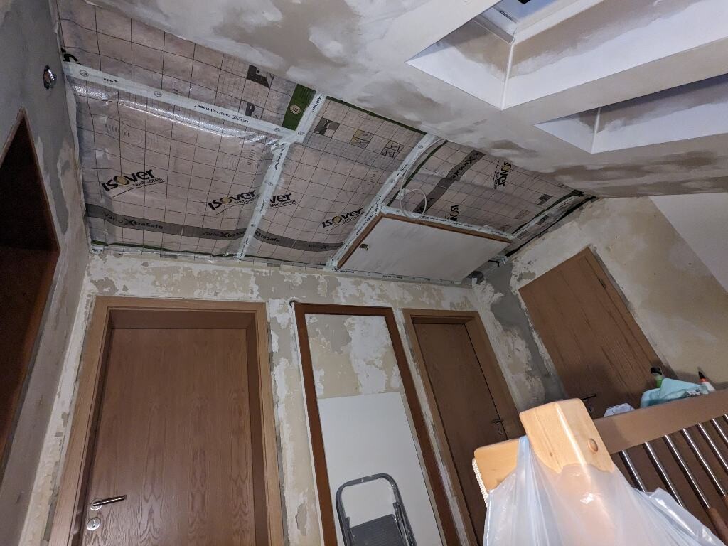 Die alte Rigipsdecke ist samt Dämmung weg.