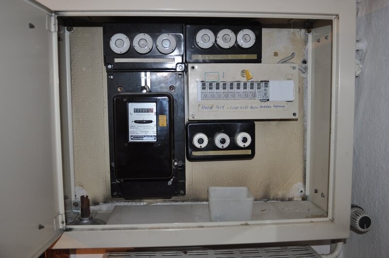 Im Flur finden wir an der Wand den alten Zählerschrank/Sicherungskasten. Es gibt eine neue Treppe ca. von 2010. Die schränke links im Bild waren nach 2,5 Jahren ohne ordentliche Beheizung/Lüftung nicht zu retten.