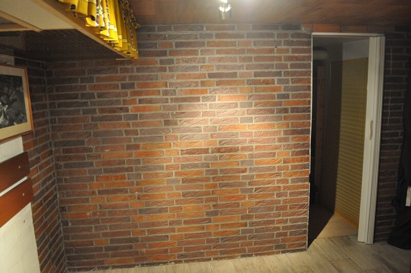Kaminzimmer, nur echt mit Holzdecke, Vorhängen und nachträglicher Klinkerwand zu einem Abstellbereich: