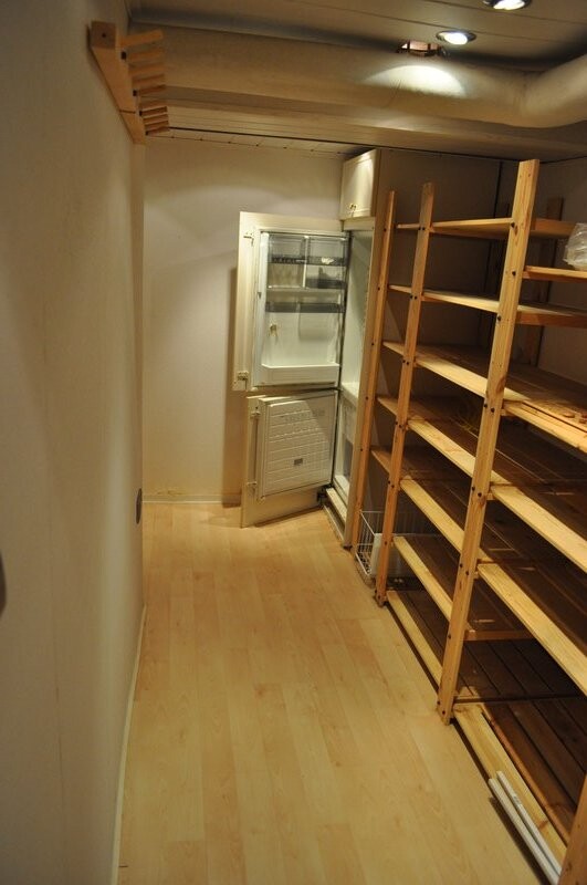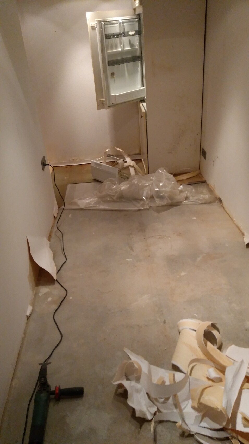 Der Abstellraum hinter der Wand wurde "wohnlich" gestaltet. Laminat auf dem Fußboden, Gipskarton an der Wand und Deckenpaneele. Keine gute Idee für arme Wand dahinter.