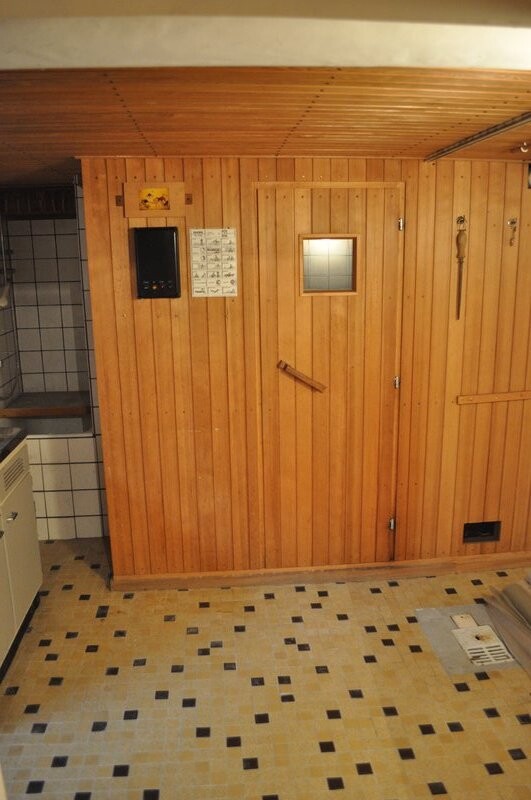 Saunaraum: links neben der Sauna eine Sitzwanne als Kneippbecken. Dazu ein waschbecken aus der Orignalküche von 1960 mit Boiler, links außerhalb des Bildes eine Tür mit Treppe zu Garten. Die Sauna (Baujahr 1968) war abgeklemmt, nur Licht funktioniert. Innen ein Lager von Ersatzfliesen und Natursteinen.