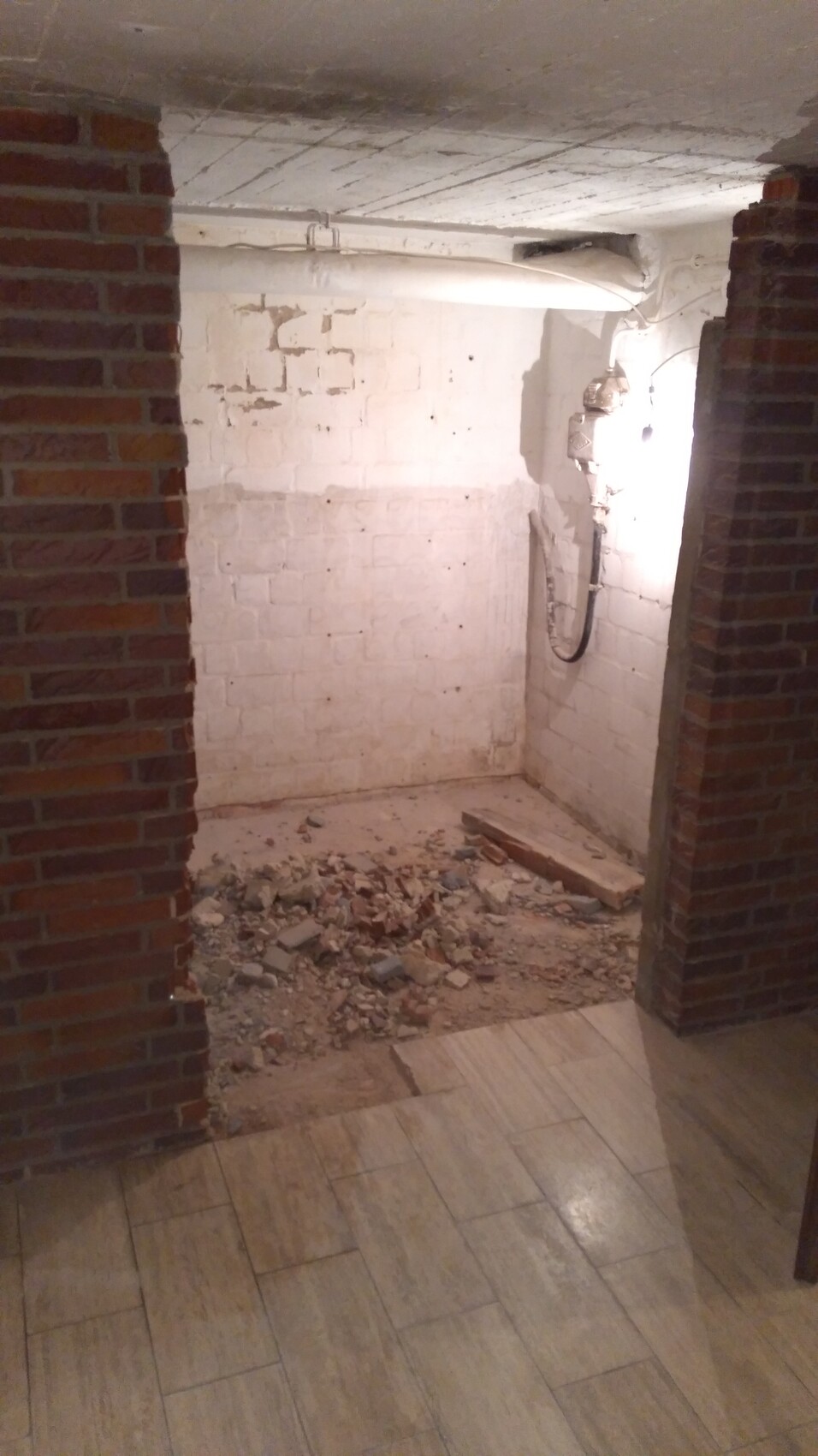 Der Durchgang ist für die geplante Rohrtrasse an der falschen stelle, also wird der schon mal verbreitert und die Holzdecke ist auch schon entfernt: