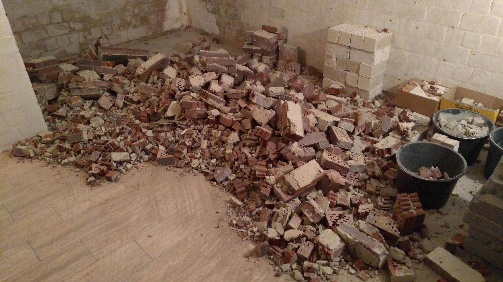Was auch weg ist, ist die Trennwand im Kaminzimmer. Säuberlich sortiert nach Bauschutt und Gasbeton (Sondermüll!):