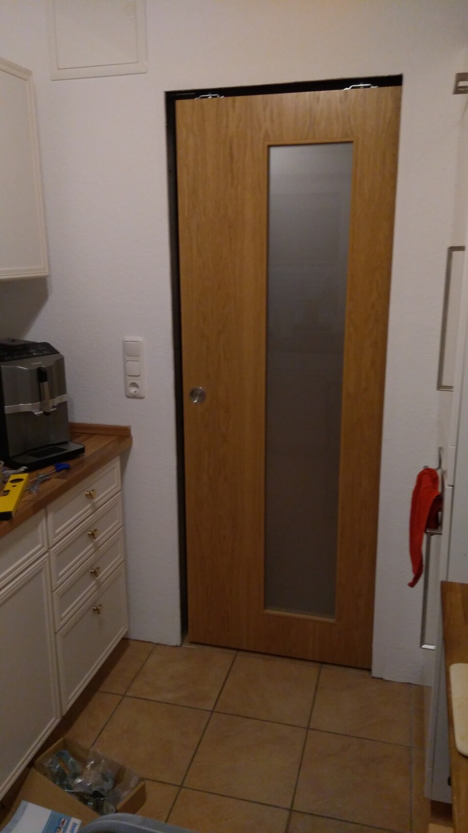 Die 735mm-Schiebetür kam erst viel später. Wieder waren alle überfordert, aber im Hornbach war man in der Lage eine Freitextbestellung zu machen. Nach acht Wochen Lieferzeit war die Tür Ende August da und eingebaut.