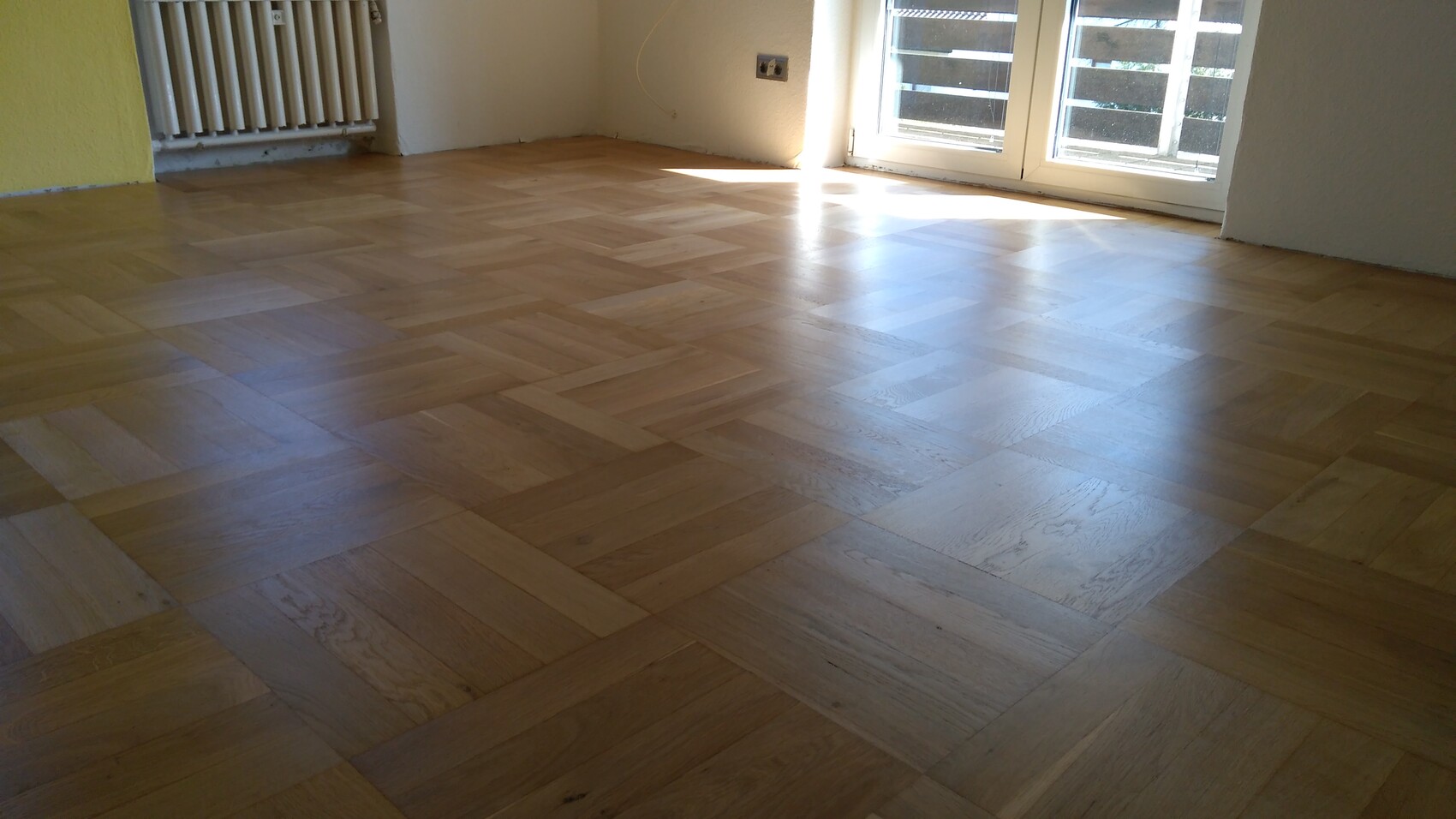 Unter dem Schrank war das Parkett erheblich in Mittleidenschaft gezogen, sodass auch im Obergeschoss sich der Parkettleger austoben konnte: