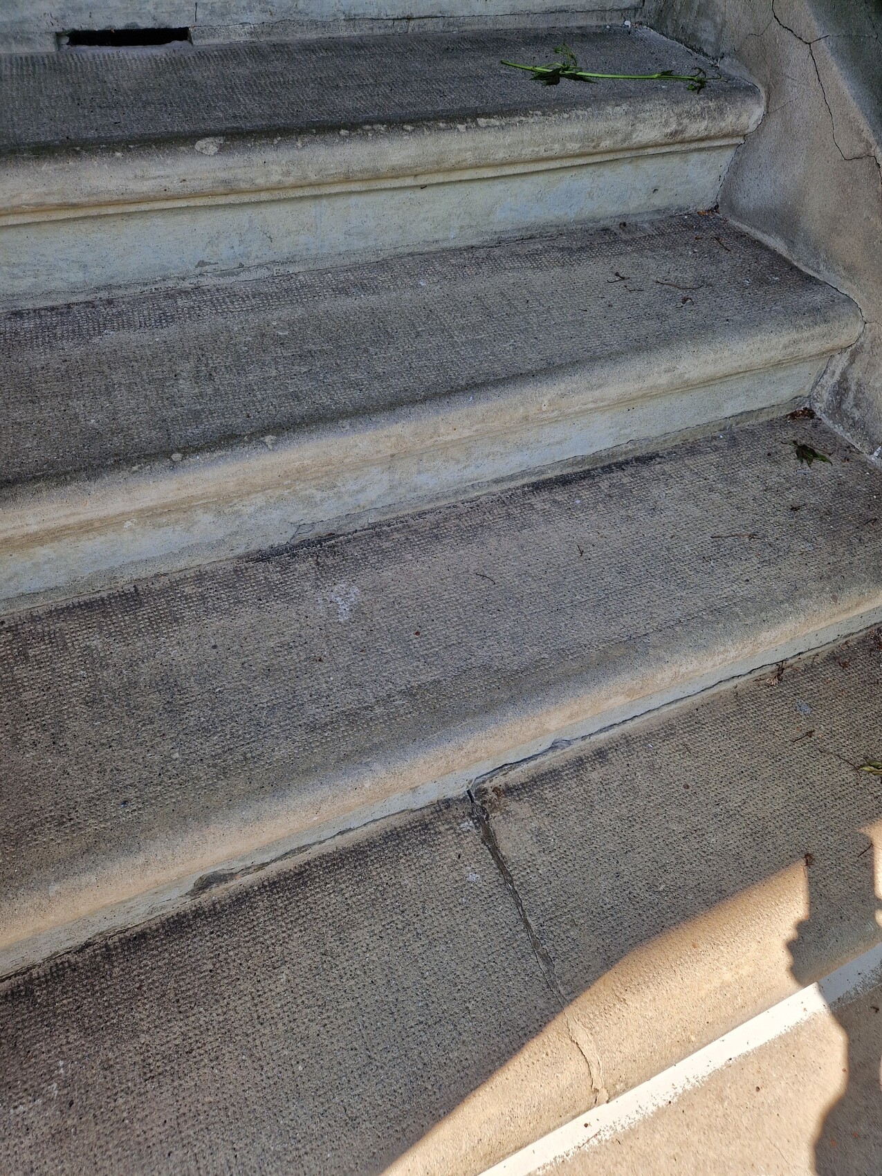 Bei den gebrochenen Stufen handelt es sich um die letzten beiden Stufen vor der Wiese. Ich würde schätzen dass sich hier etwas gesetzt hat und die deshalb zu Bruch gegangen sind. Die dritte gebrochene Stufe ist unter dem Vordach. Auch hier vermute ich, dass der Schaden nicht durch eindringendes Wasser verursacht wurde.