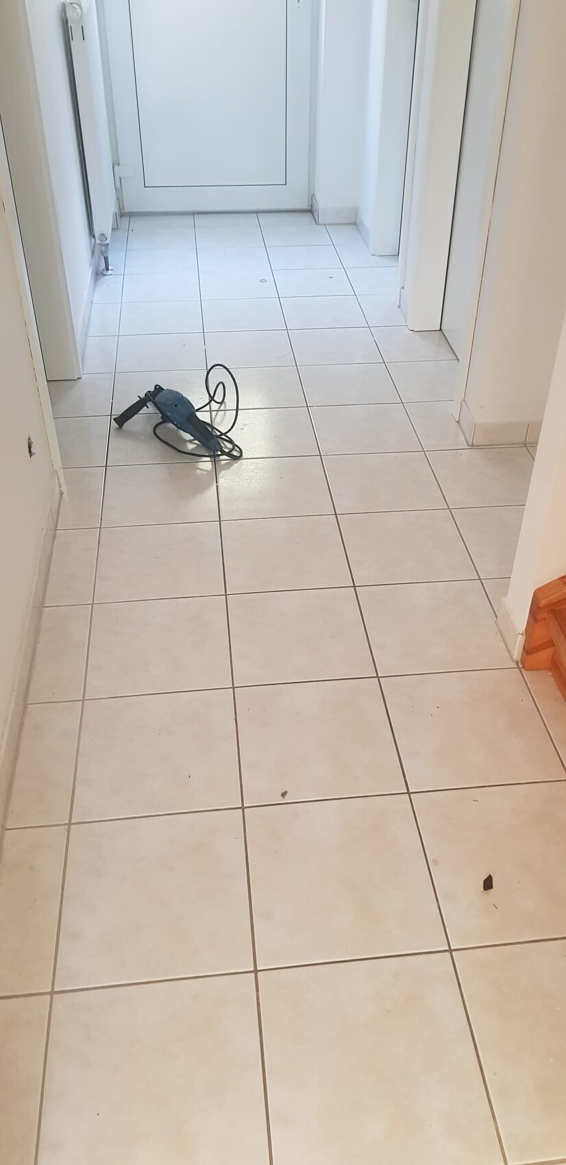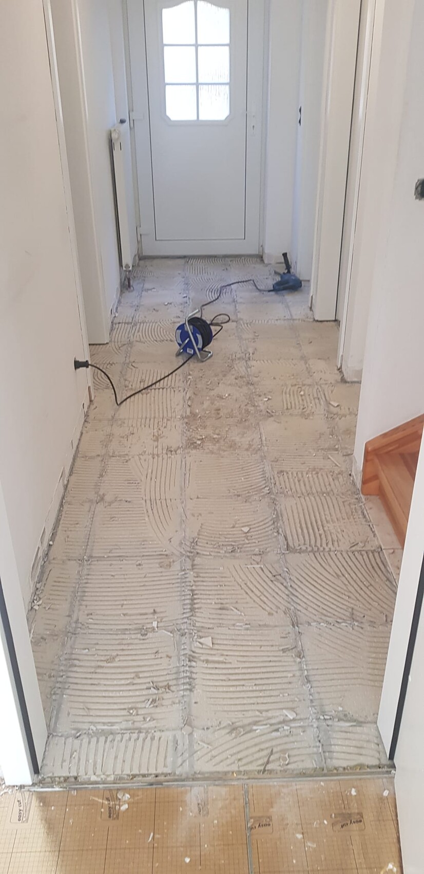 Die Fliesen im Flur unten und der Küche haben wir gerade rausgehauen.