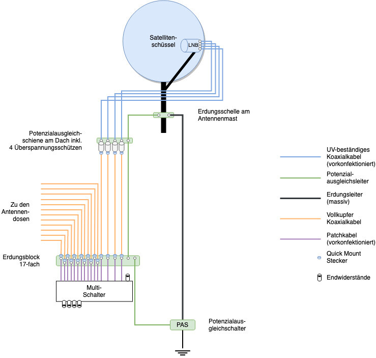 Wichtig ist dann nur noch, dass man an den Potenzialausgleich, die Erdung und UV-beständige Koaxialkabel (außen) denkt. Aber das sollte ein guter Elektriker dann schon auch von selbst so machen.