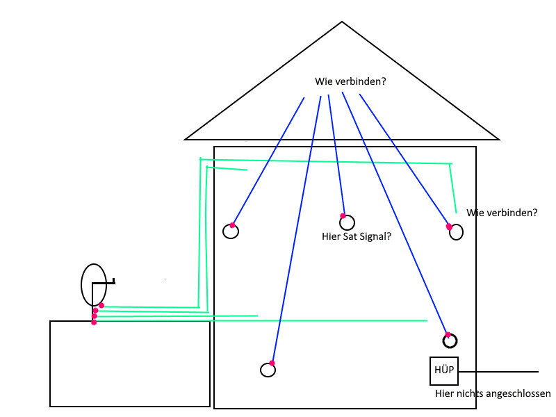 Skizzen oder Fotos als Anhang einzustellen ist aber zulässig.Okok. Ich hab's verstanden. Ich habe jetzt mal versucht es aufzumalen. Das grüne sind die neu verlegten Coax-Kabel für die Sat-Anlage. Das blaue sind die alten Kabel. Die roten Punkte sollen verdeutlichen, dass dort eine Verbindung besteht, d.h. das Kabel dort angeschlossen ist. Alles andere hängt in der Luft. Das Runde sind Dosen.