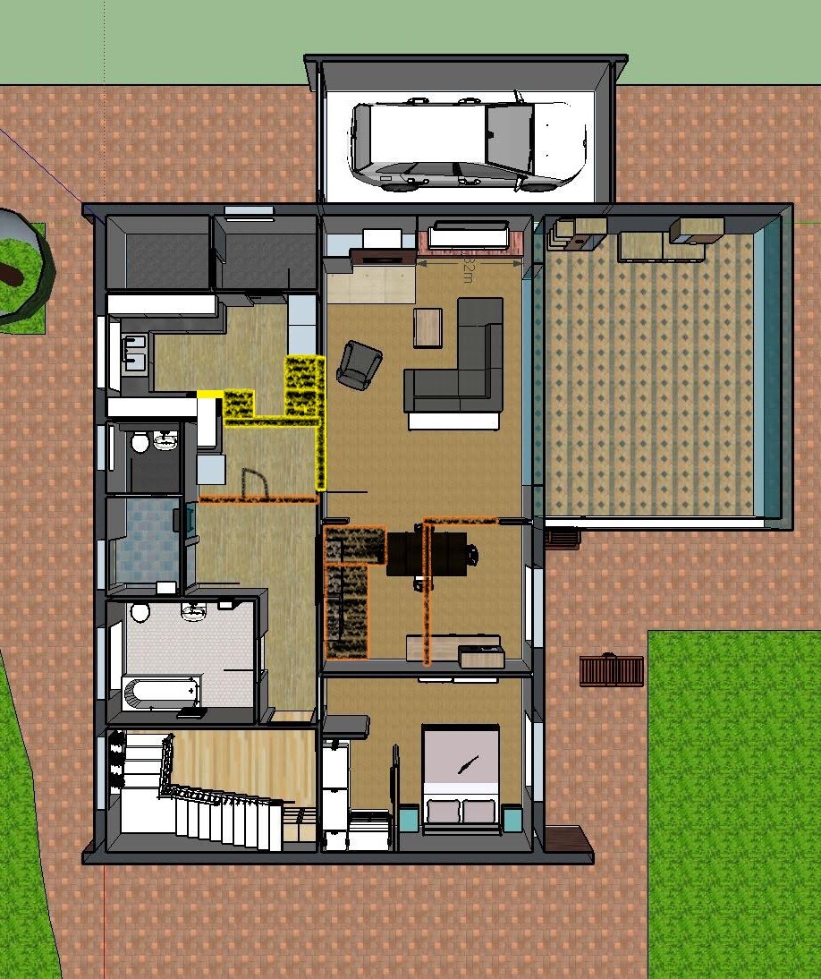 Ich habe das mal grob eingezeichnet. Orange sind neue Wände und die Treppe, Gelb verschwindende Wände und schränke.