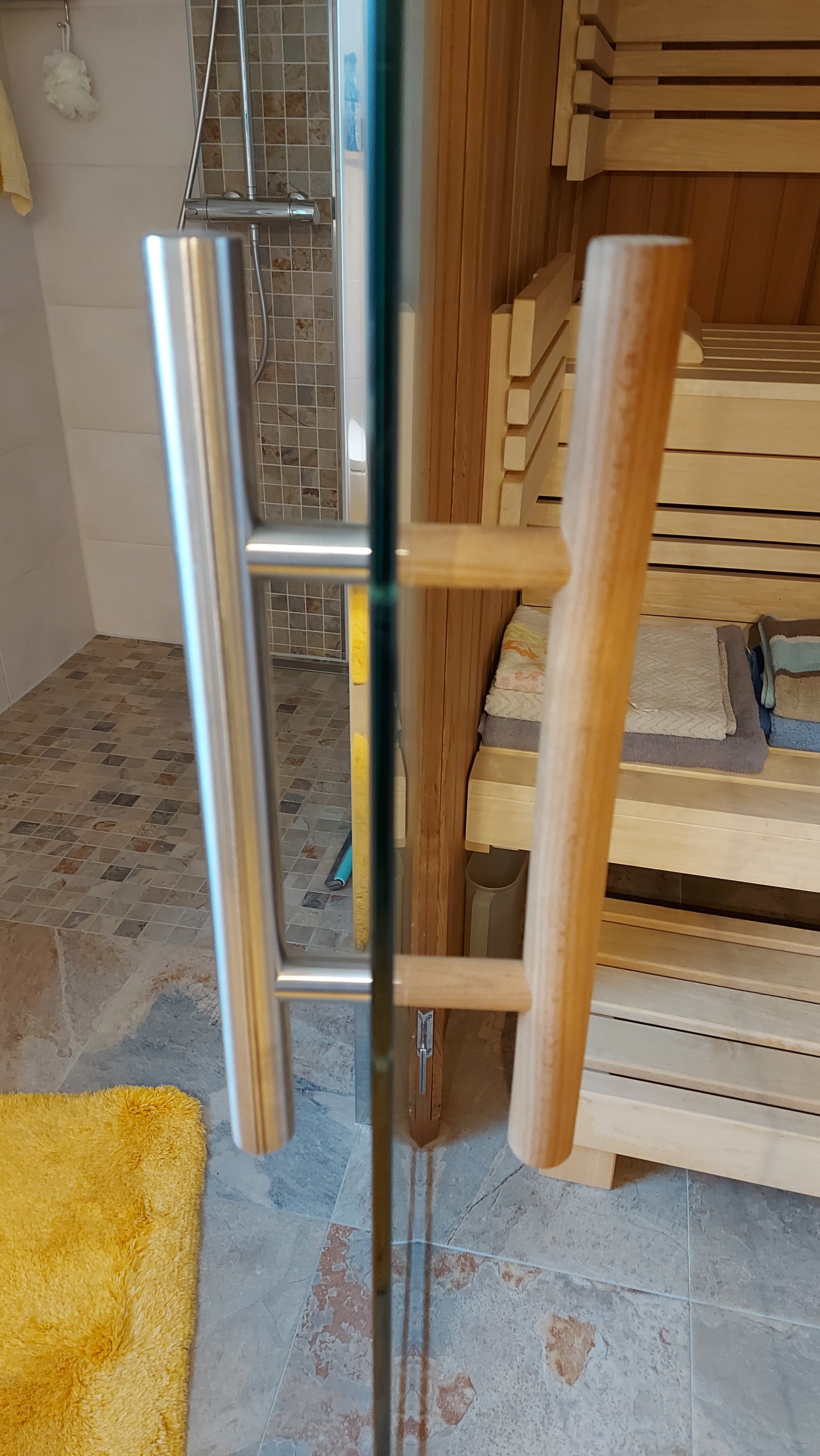 Ist das so üblich?Ob üblich bei gekauften Saunen weiß ich nicht aber wenn z.B., Jemand die Tür kurz aufmacht gehr ja deutlich mehr warme Luft raus als durch 1-2mm Türspalt. Ich habe meine damalige Sauna nur noch auf ein paar Bildern und im Kopf. Auf jeden Fall hat die einfache Glastür gegen den Holzbalken geschlagen, omatte1987 schrieb: