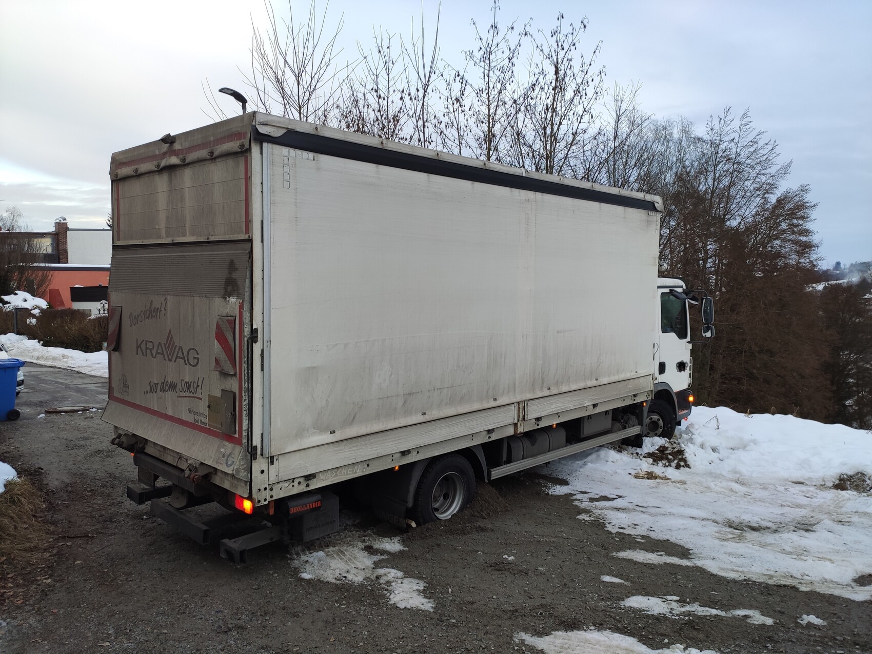 Der nette Fahrer der Spedition hat sich dann auch noch in unserer Schotterzufahrt beim Wenden mit seinem Lastwagen festgefahren und halb eingegraben (Das war ne Baustellenzufahrt, da sind viel größere Lastwägen problemlos umgedreht).