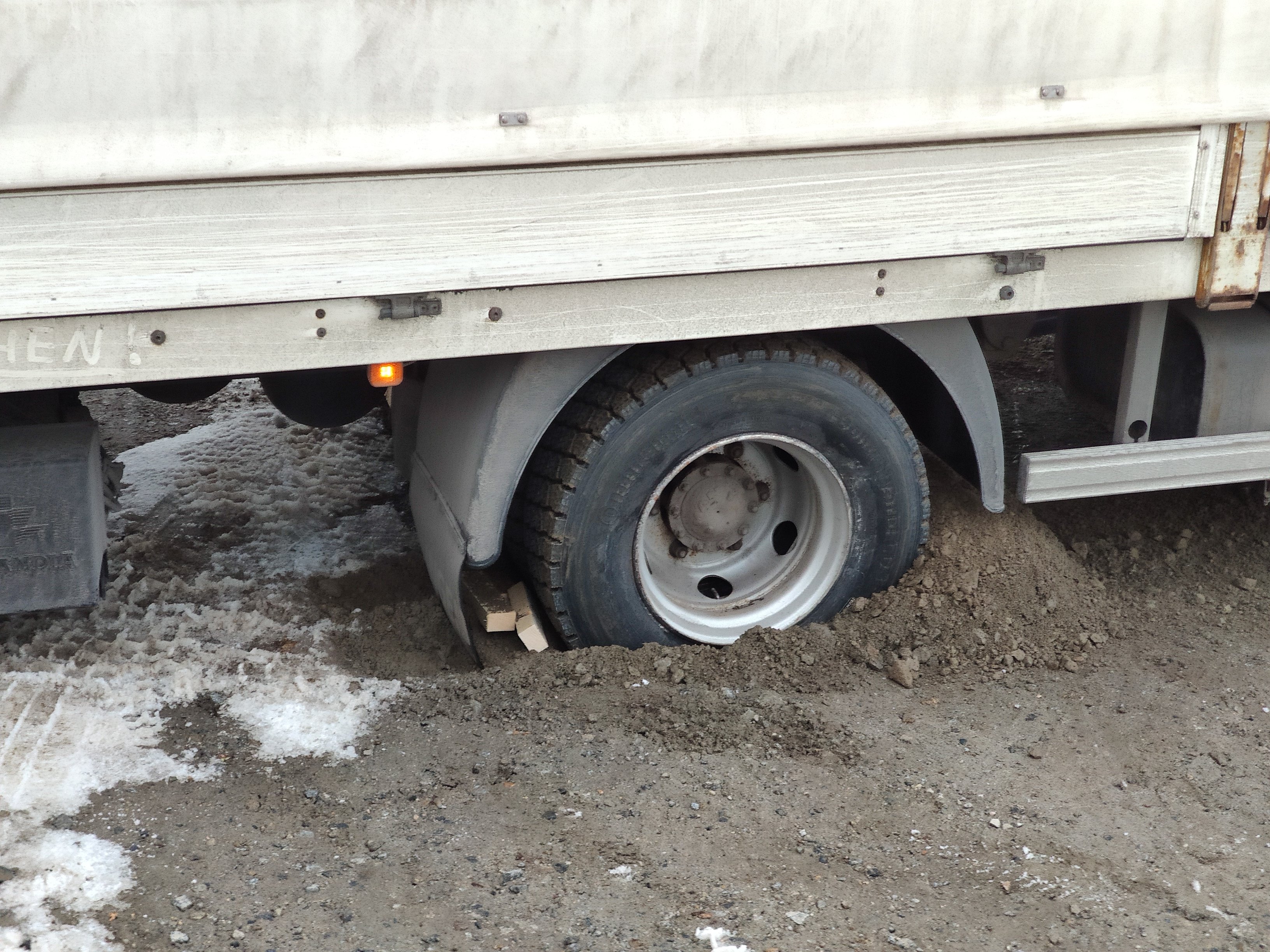 Nachdem Ausgraben und Holz unterlegen nichts brachte, musste er seinen Kollegen zur Hilfe rufen, der ihn dann mit großer Mühe wieder raus bekam.