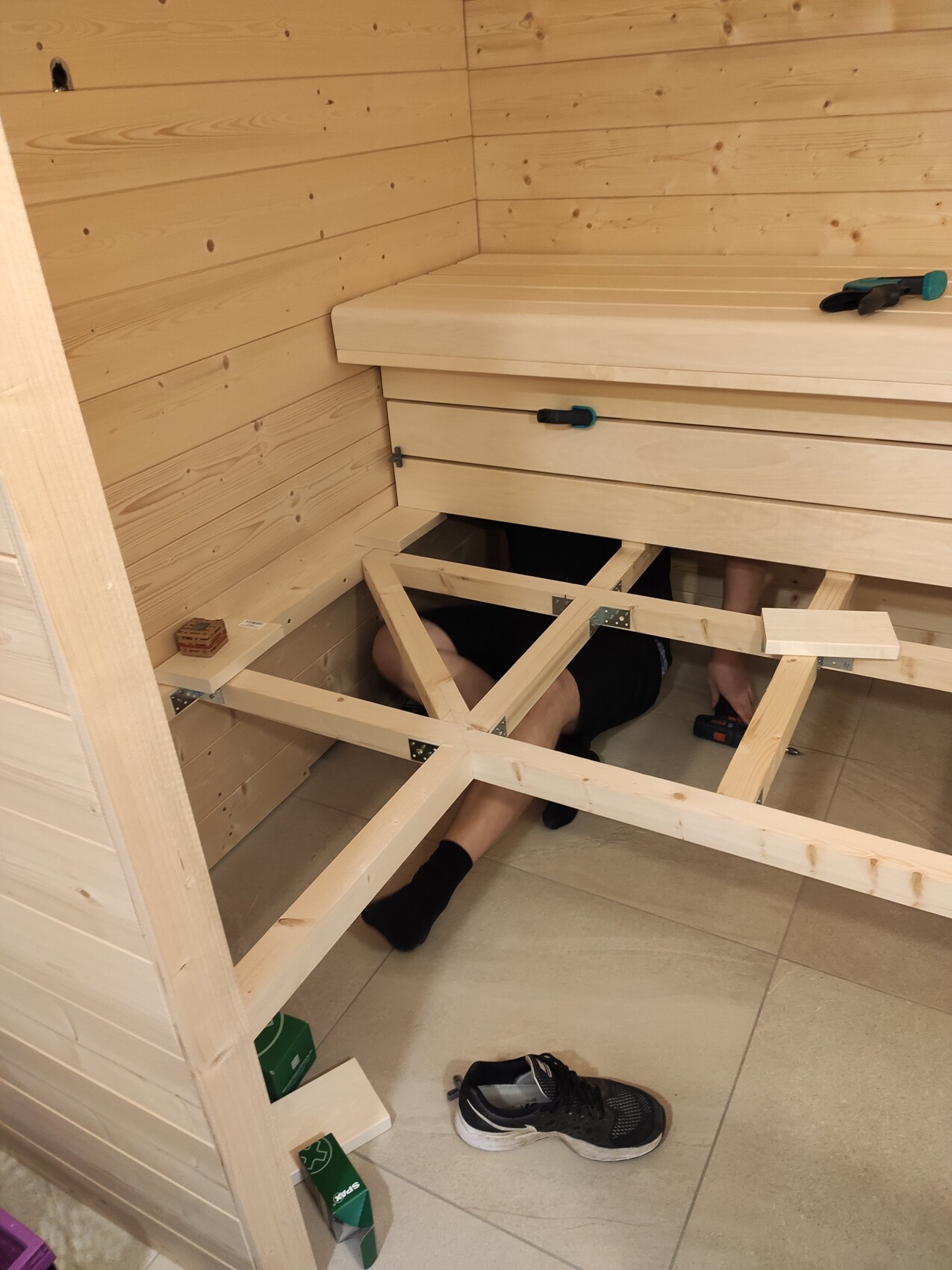Ich bin definitiv zu groß und dick für solche Arbeiten. Wäre beim Verschrauben fast unter der Konstruktion stecken geblieben... 😀 Meine Frau ließ es sich natürlich nicht nehmen, das festzuhalten. 🙄 😉