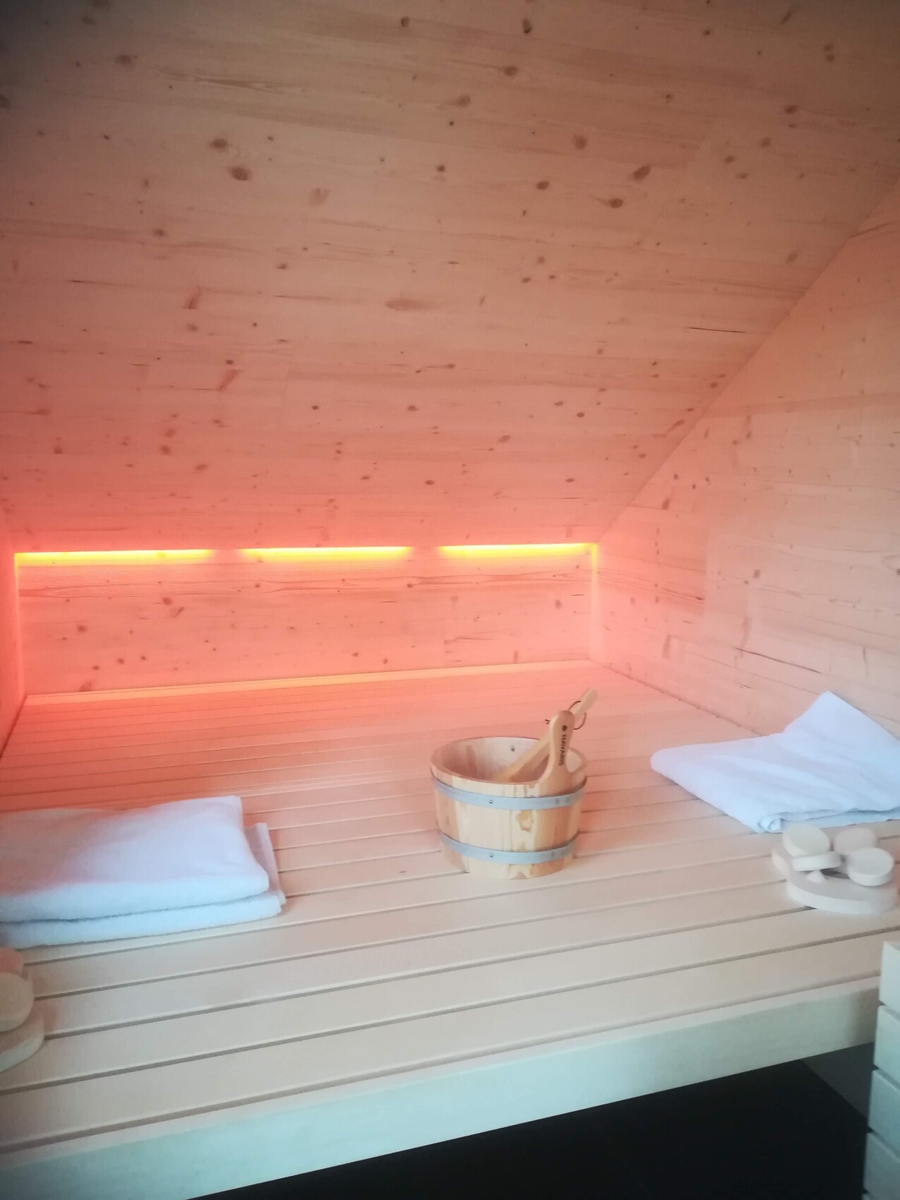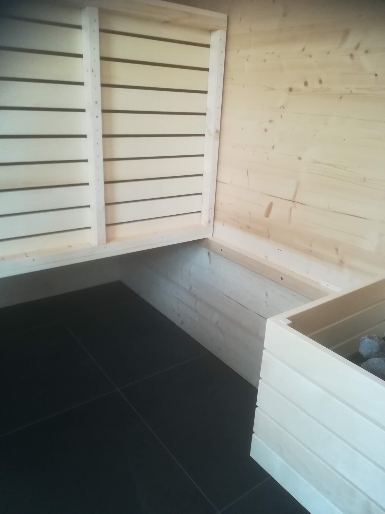 Für 2 Personen reicht die Größe. Wir haben uns für eine etwas andere "Inneneinrichtung" entschieden. Da die Sauna ja doch recht klein ist, wären alle Bänke irgendwie knapp geworden, entweder von der Tiefe oder der Länge. Daher haben wir uns entschieden, eine große Liegefläche zu machen, die etwas höher ist, als das normale untere Sitzbankerl (so in Oberschenkelhöhe). Für uns ideal, da hat man jetzt wirklich Platz zum Hinlegen. Für die Liegeflächen gibt es von entsprechenden Händlern schon quasi Fertigbankelemente. Wir haben aus zwei solchen Fertigelementen unsere Liegefläche. Ganz praktisch: wenn man mal unter der Liegefläche wischen will, wird die eine einfach hochgeklappt.
