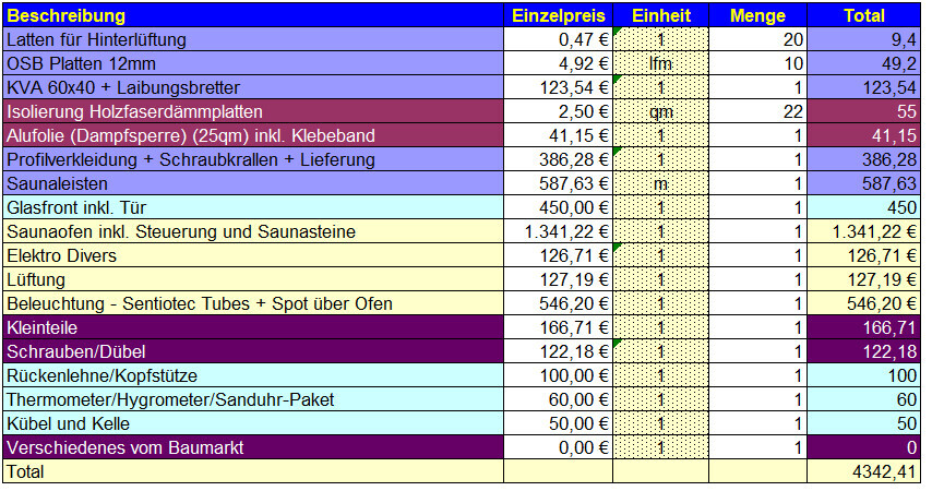 Farbig codierte Tabelle mit Baumarkt-Artikeln, Preisen, Mengen und Total.
