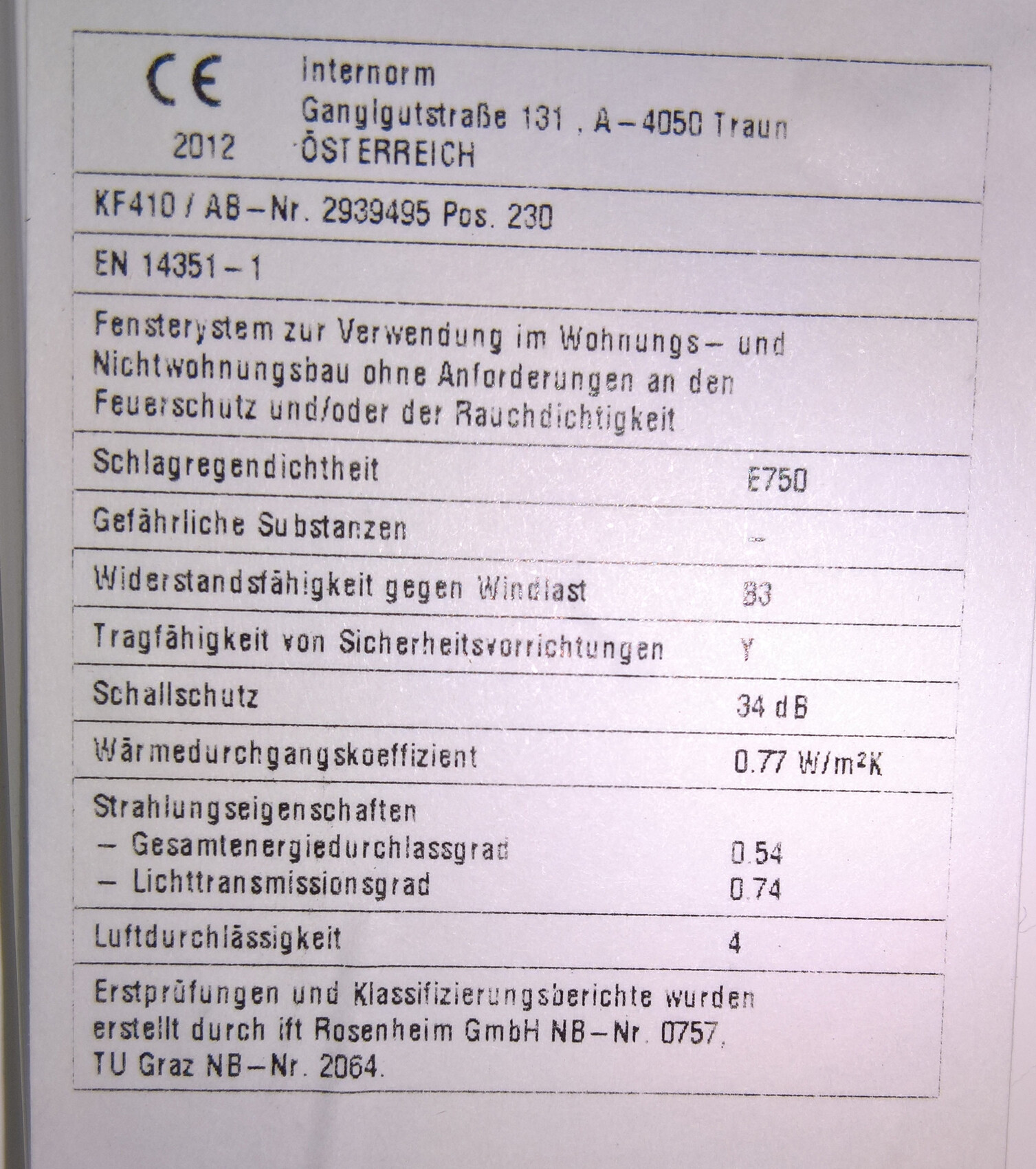Ich habe eines der Fenster vor dem Einbau zu Gesicht bekommen und den Aufkleber abfotografiert: